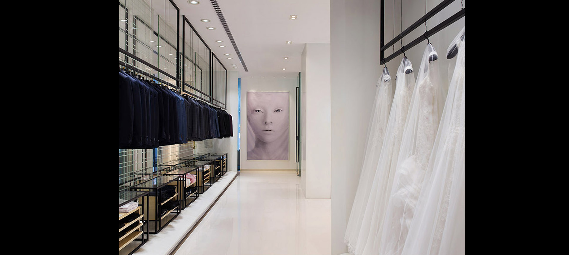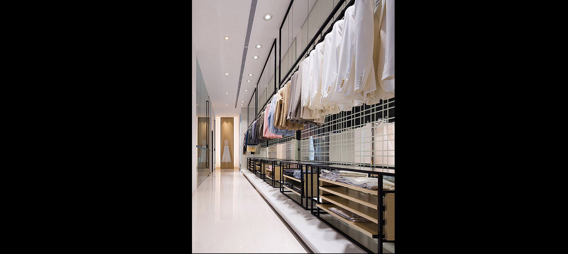 摄影生活馆以开放的空间布局展开,一二层之间以共享中庭的形式建立联系,以大面积的象牙白色打底,与各种款式各种风情白色婚纱一起,为整个设计铺陈纯净圣洁的调性,用简洁轻盈的黑色线条勾勒形态,凸显干脆利索的设计风格。
