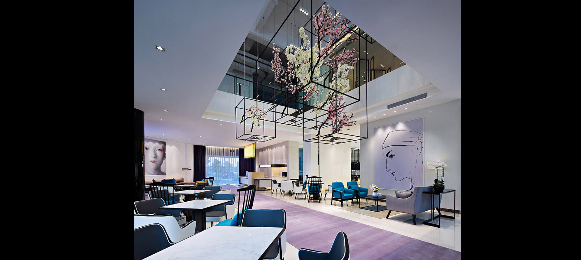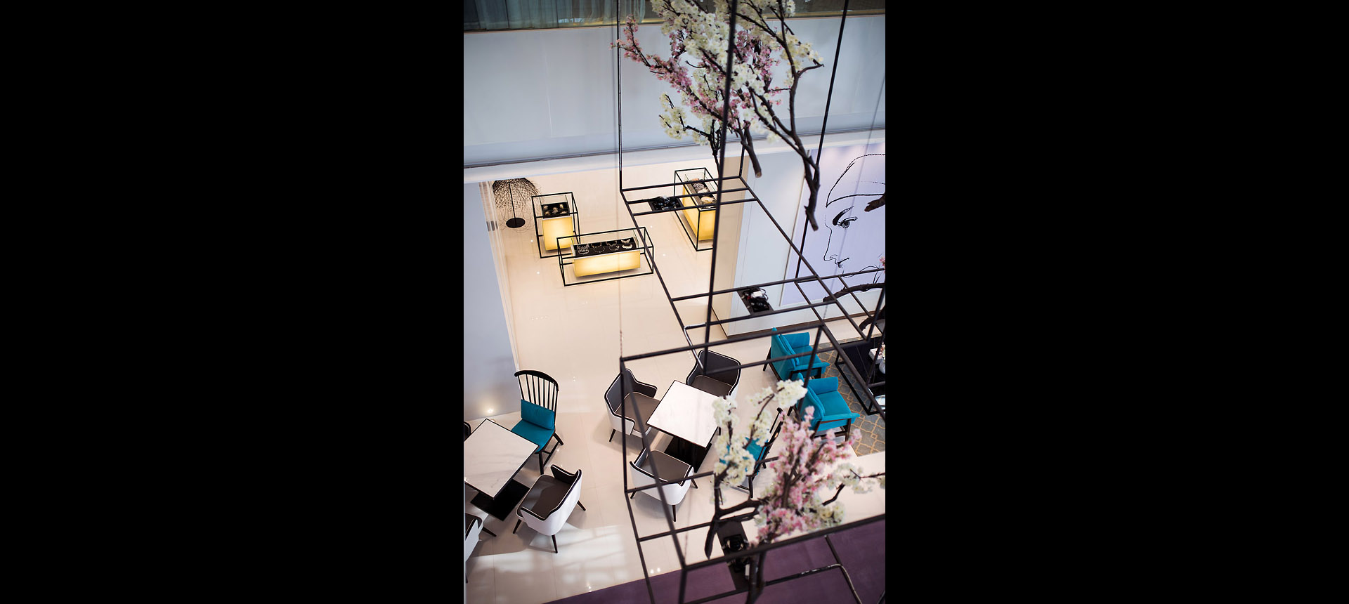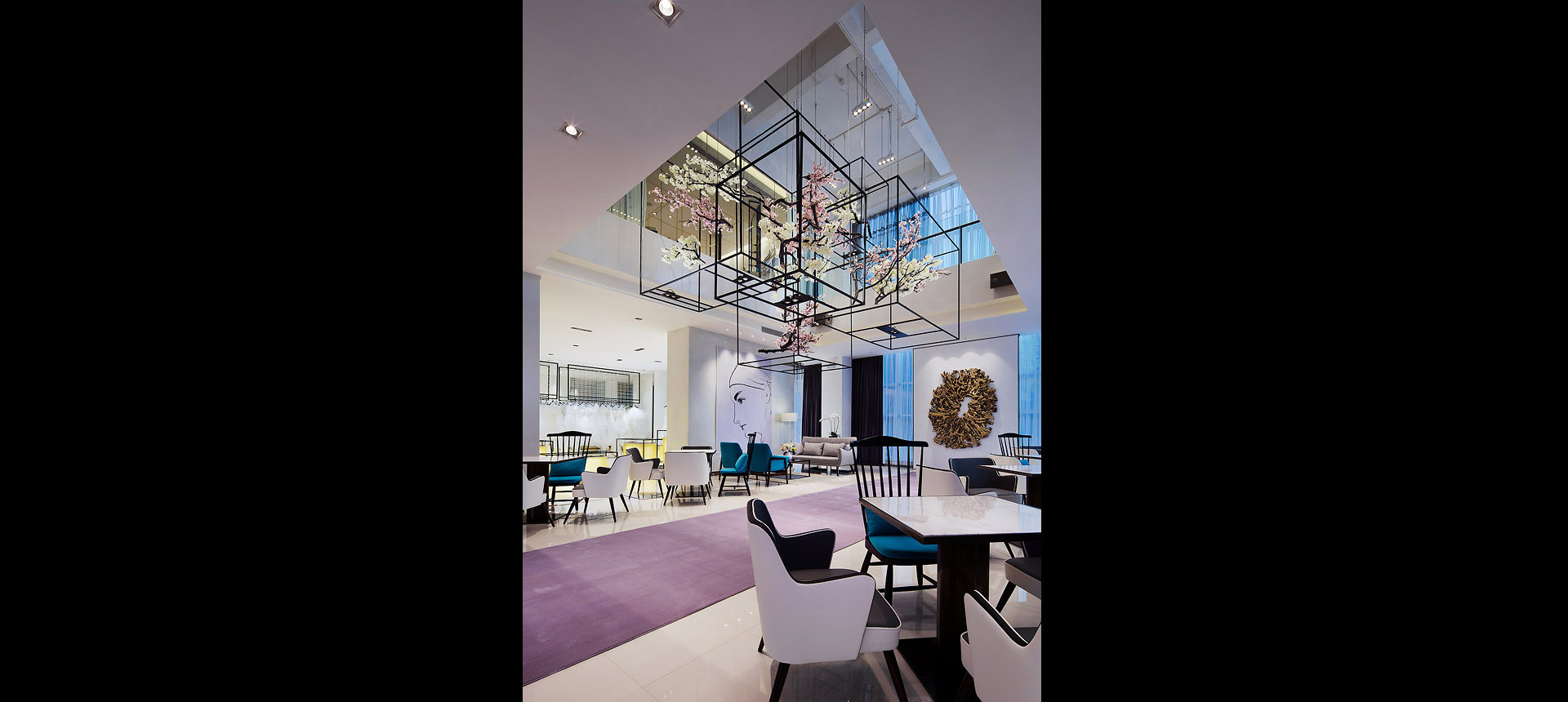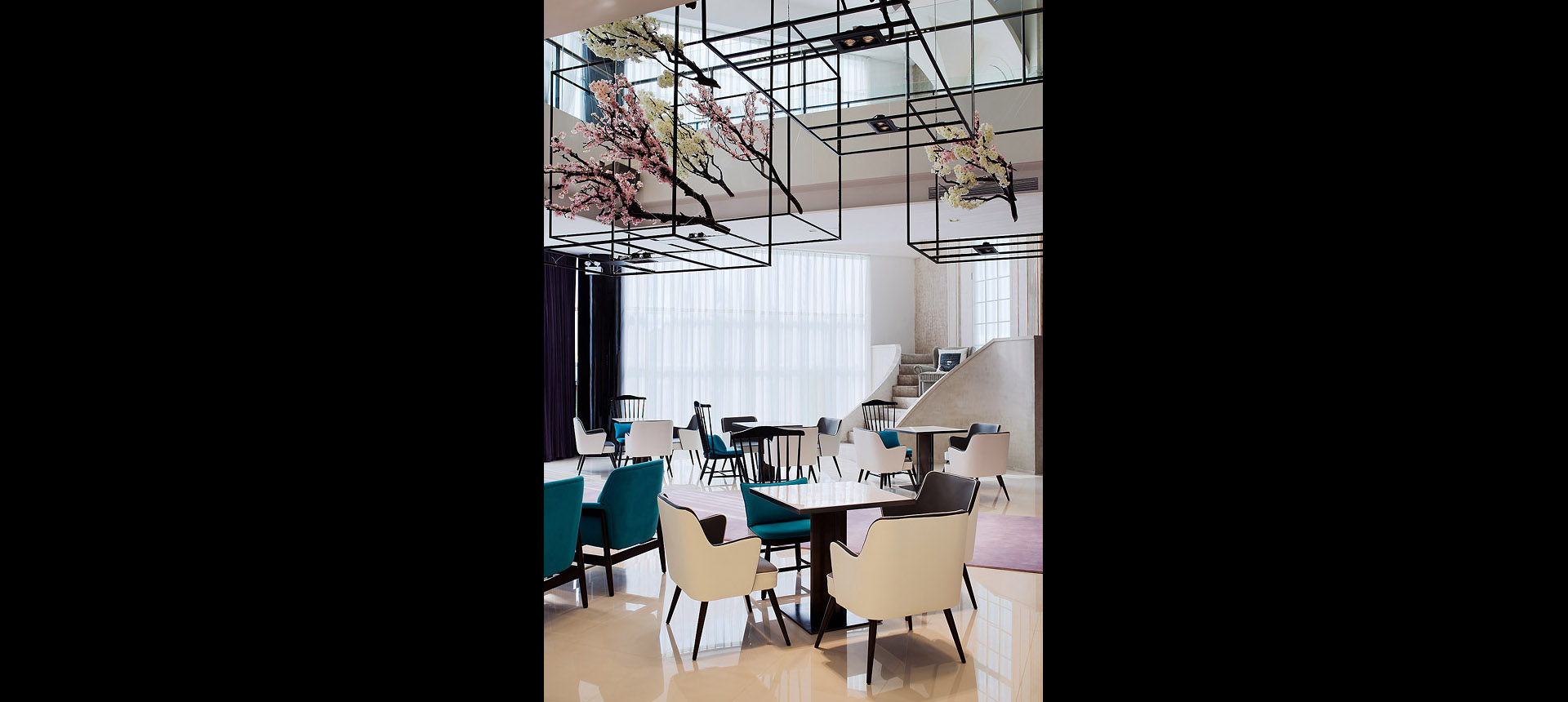 粉红、粉黄、粉绿的樱花树枝点缀在空间之中,为空间注入温馨浪漫的调性,Tiffany 蓝与柠檬黄搭配在黑与白强烈对比当中显得夺目耀眼,充满了淸爽欢快而又不失高贵的时尚格调。