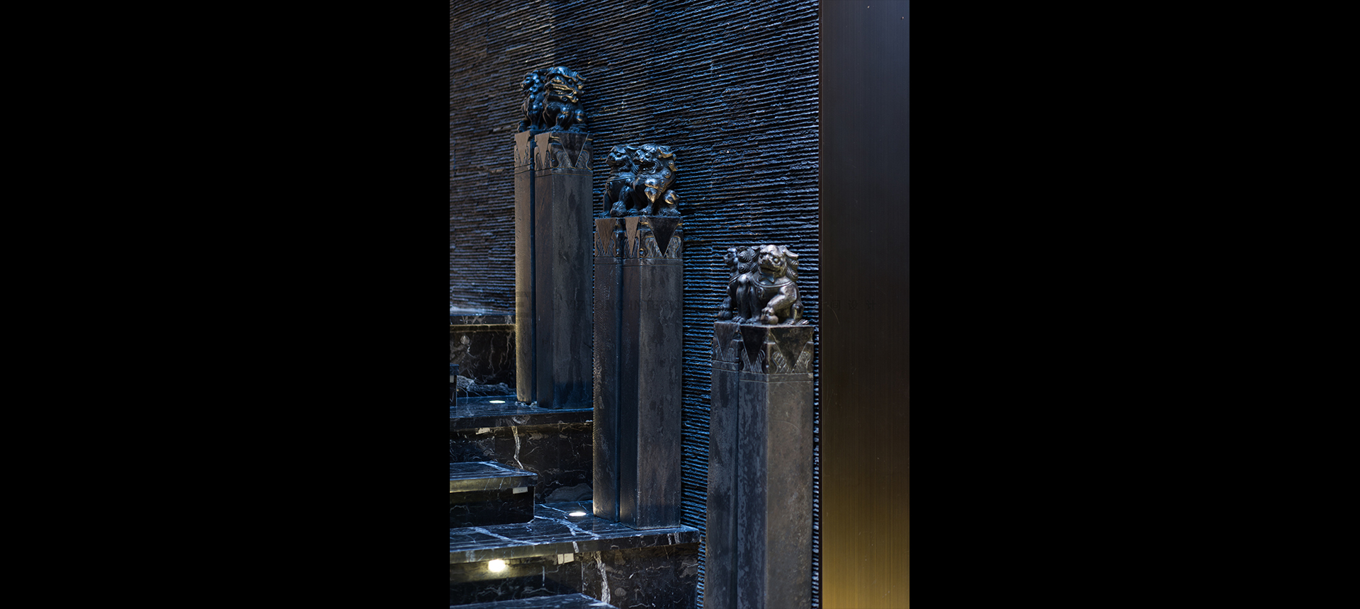 Natural light pours down through the skylight with bead curtains like waterfalls-motion in stillness. The walls made of culture stones along with the vertical greening plants create a sense of flow lines and bring people back to nature.