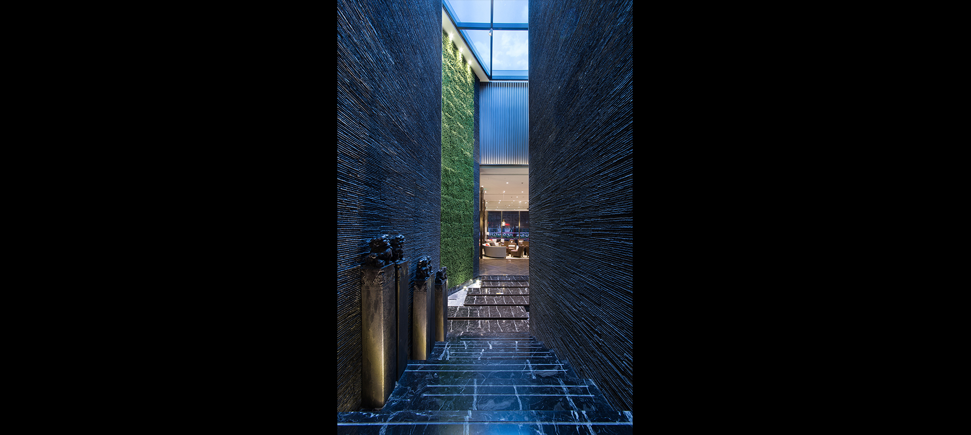 阳光与水晶珠帘透过中庭天窗倾泻而下,宛如细水瀑布,营造静中之动。富有线条感的文化石墙与垂直绿墙的相互映衬带来一股绿意与流线感。