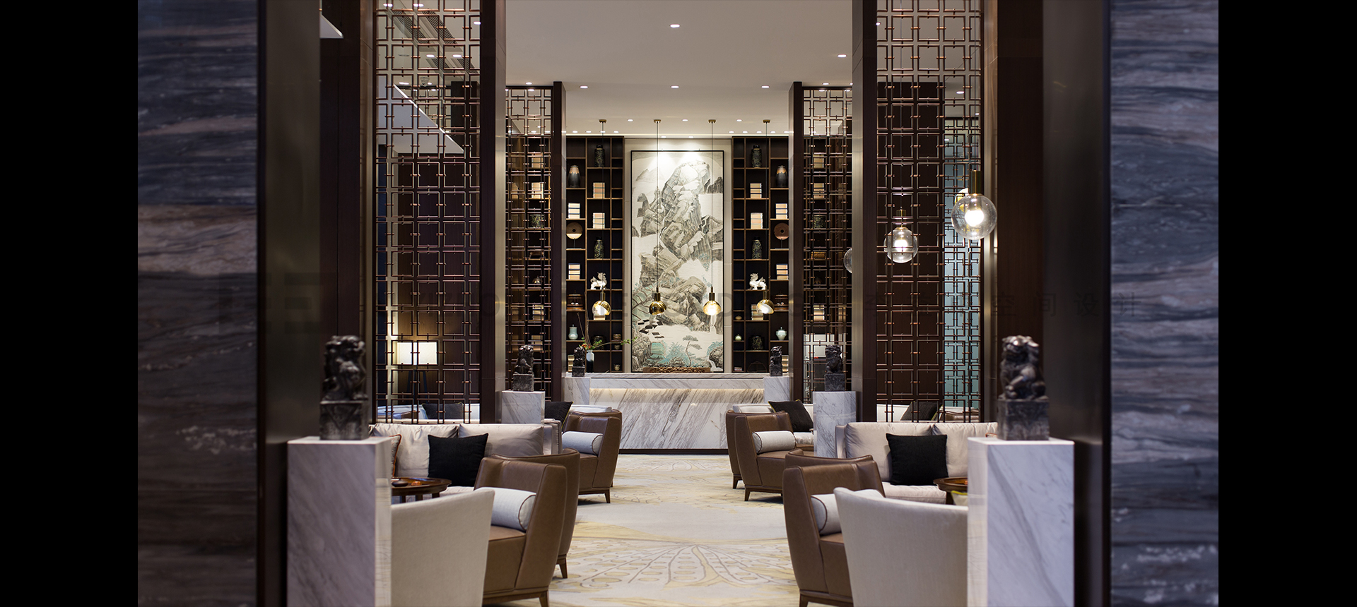 设计主材:奥巴马木纹石、星河时代大理石、蓝金沙大理石、爵士白大理石、文化石、木饰面、古铜拉丝不锈钢、皮革硬包、布艺硬包