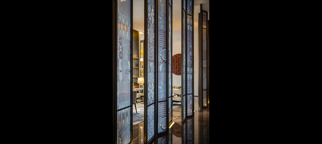 时光隧道,梦幻而神秘。石材上不规则的条形壁灯,照应在大理石上,反射出一条条婀娜多姿的形态,交相辉映,犹如置身在万花筒般的意境里,真真假假、模模糊糊。展现历史性与现代化的共生关系,就如行走在时空任意门的边缘。