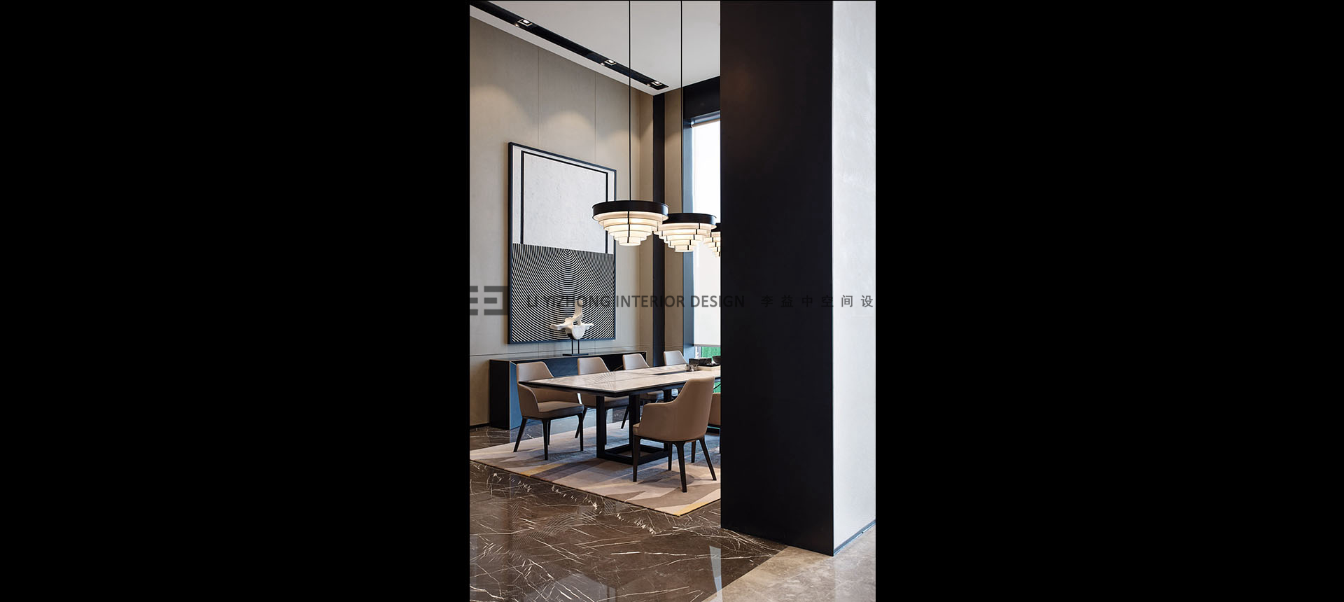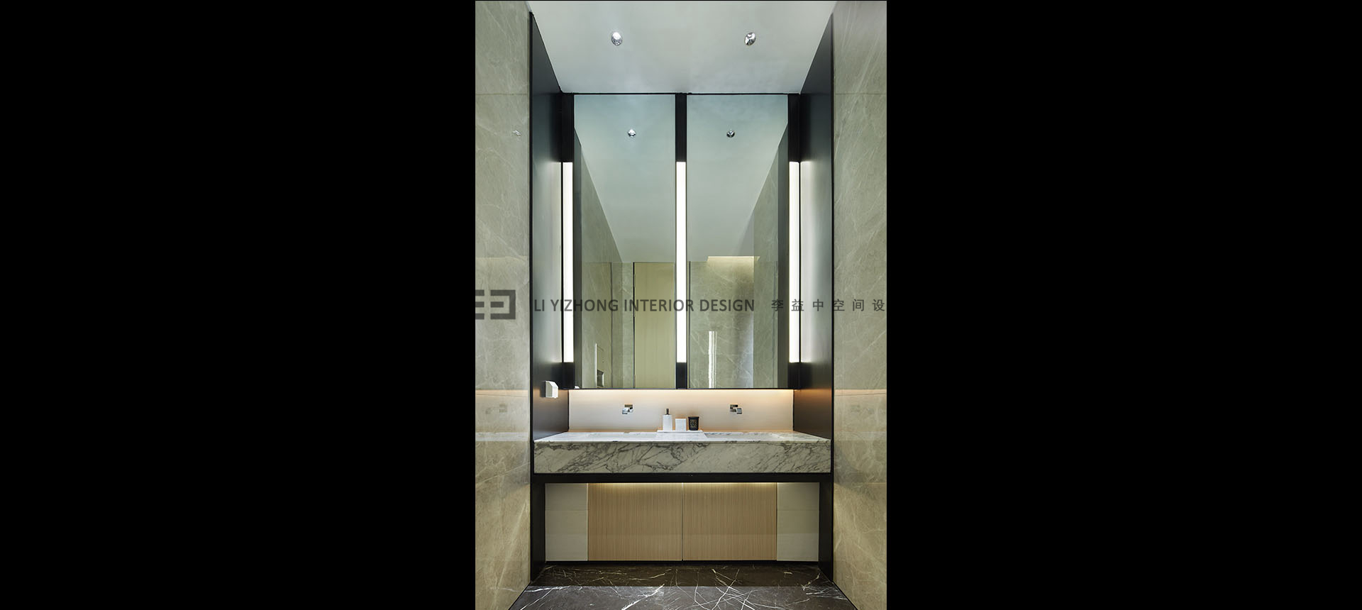 入口处简洁大方,在轴线关系上,设计师通过线条与块面的穿插,使空间创造出不一样的构成感,打破传统轴线对称的关系设计,相互穿插,既不乏味,亦不凌乱。大理石与木饰面相互映照,时尚简洁,大气脱俗。