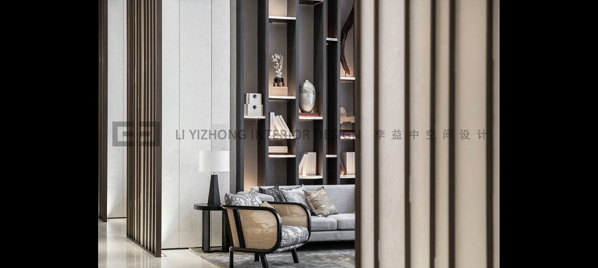 洽谈区的水吧台为中心,洽谈单椅围绕其散落四周。洽谈区的光影柔和,仿若牛乳一般,在竖向排列的线条秩序流向中,水吧台吊灯的纵横交错的构成如大珠小珠落玉盘的搭配,似星空点点繁星统领了空间,成为空间焦点。吧台的剁斧石的粗朴质地和应沙发、座椅及毛毯的柔软,以及空间界面的光洁,唱出材质的交响。