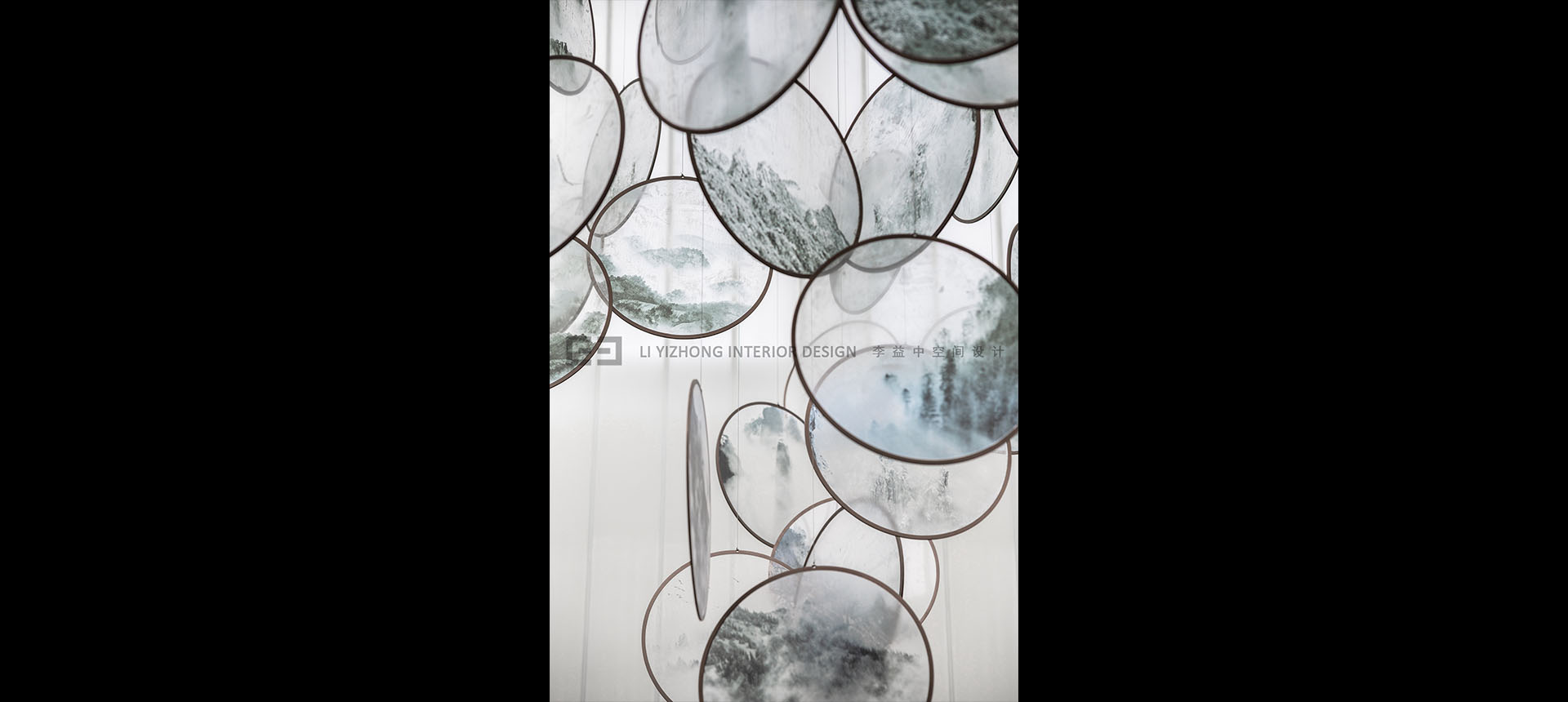 日光朦胧,亚克力吊挂似水墨晕染山水画,与光发生交叠,撒落树影婆娑,运用通透的材质让光在屋内漫游并创造出不同的变化,让光线以丰富的形式在建筑内部留下痕迹,如山涧薄雾暮色正雅般迷人。