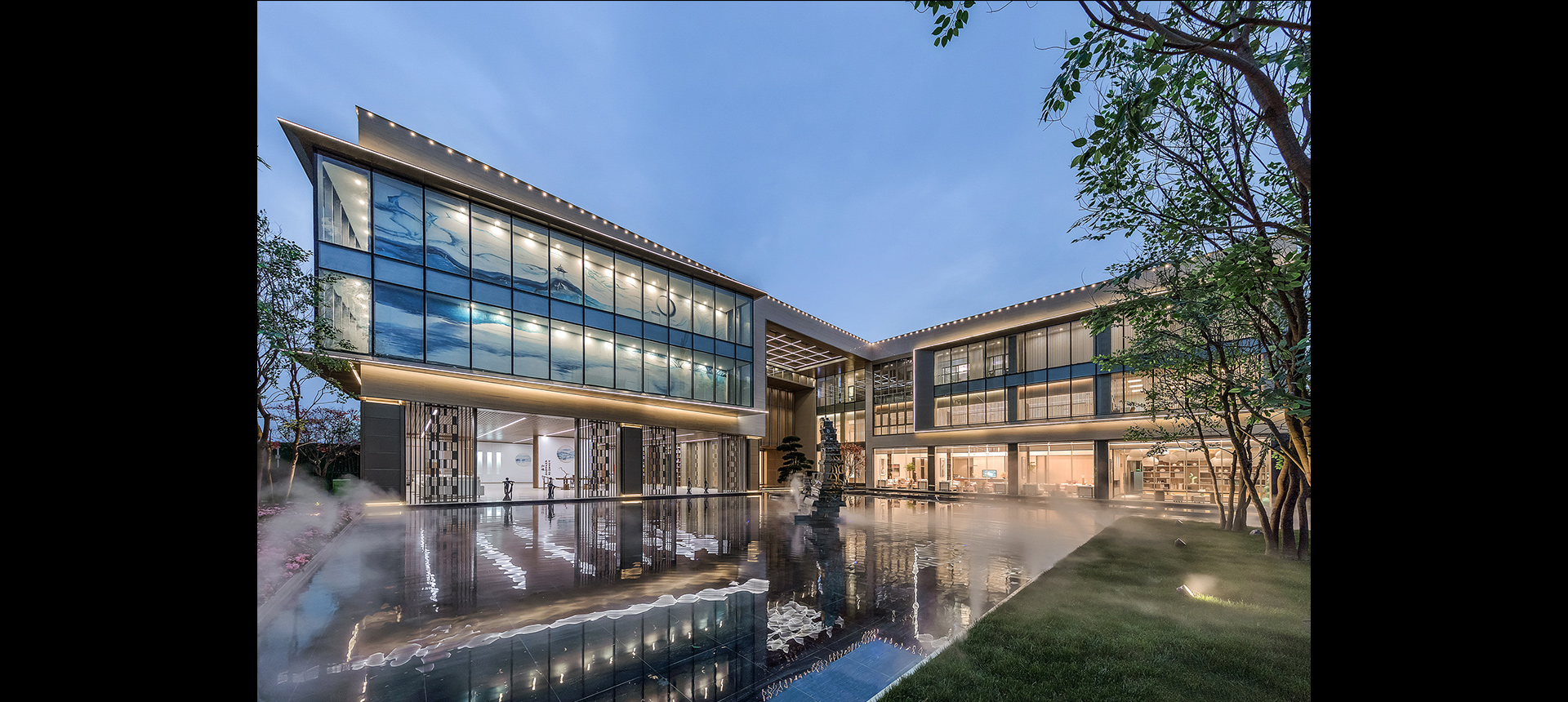 在南昌青岚大道以东荷花路以西的中海·锦城售楼中心,建筑以高台之势被无边际水景环绕,在蓝天之下,有着秋水共长天一色之境。“绿水净素月,月明白鹭飞”的意境,成为了设计师在进行室内空间设计时的灵感出发点。设计师想在室内造就出一处可以抛却欲望凡尘,聆听心声的领地。