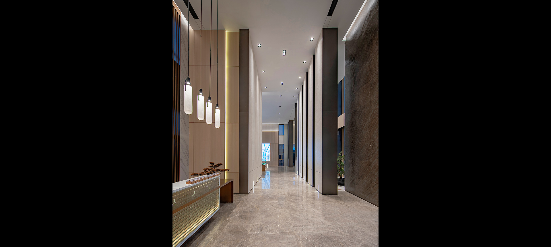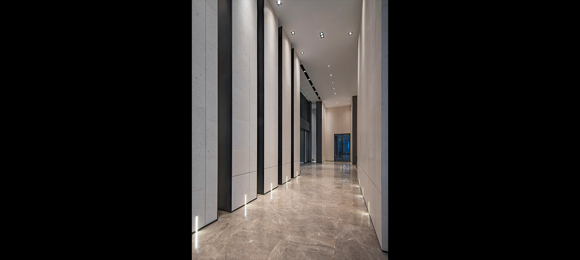 接待厅到沙盘区之间有一过厅,过厅立面结合原建筑的柱体做了虚实的分割,使室外光线与景观映入室内,柱体相对而立,底部嵌入墙体灯带,倒影于大理石地面,形成轻盈的序列感。亦如暗示访客,这场“停留”之境的序幕已渐渐拉开。先抑后扬的空间节奏感悄然无息。