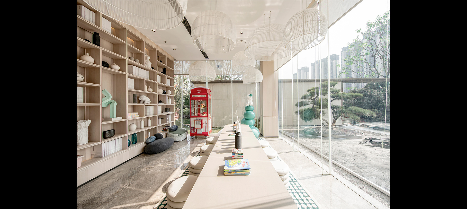 亲子书吧承担了项目展示区入口的第一视觉,所以设计上着重把这里的空间向外打开,整面纯白色书架和书桌,简洁雅致,许多鸟笼造型的灯具错落有致的悬于上方,加上造型好似围棋子的座椅,给室内增添了灵动性和趣味感。