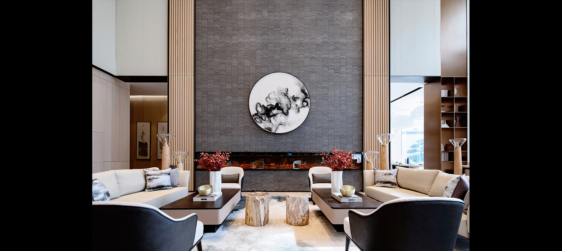 大厅内,洽谈区后的背景墙极具视觉冲击,层层叠叠的灰瓦,是对自然材质的合理编排,附上一幅淡水墨晕染的画, 有着古朴淡雅的东方气派。
