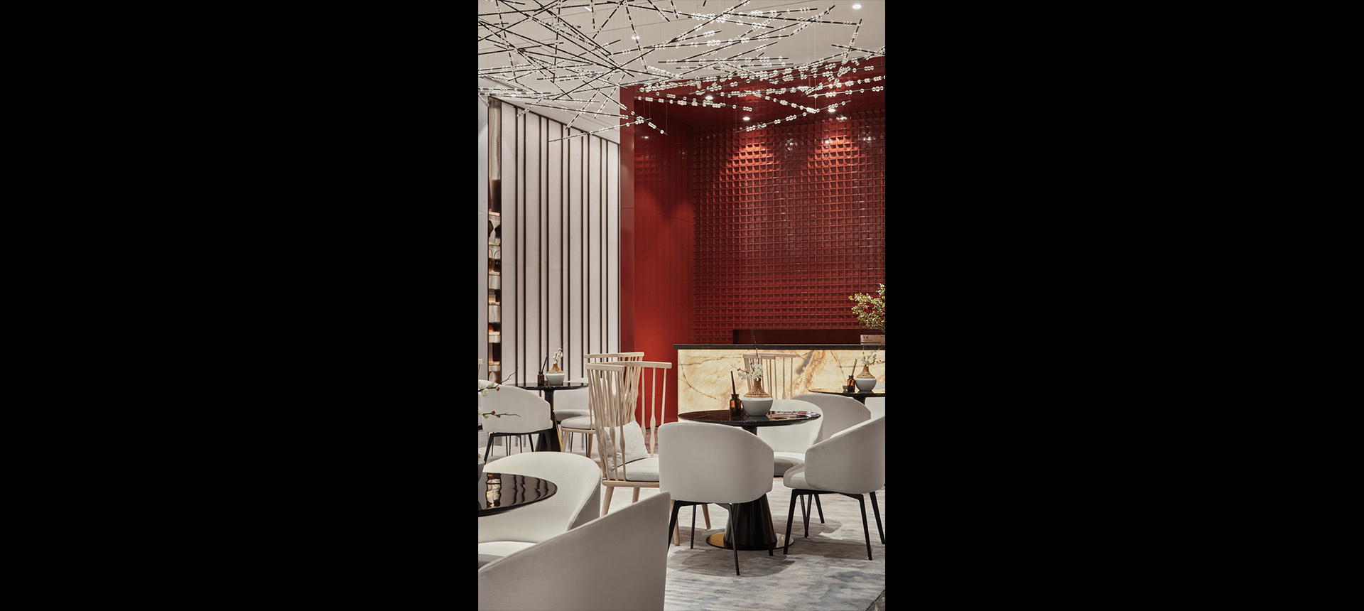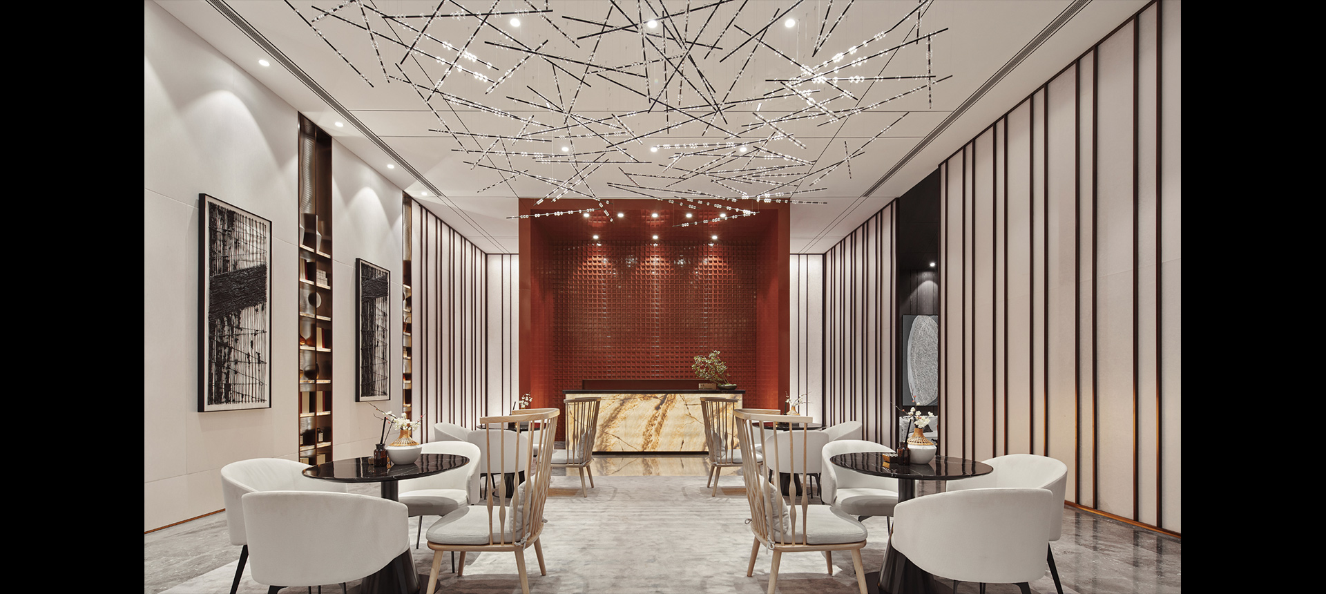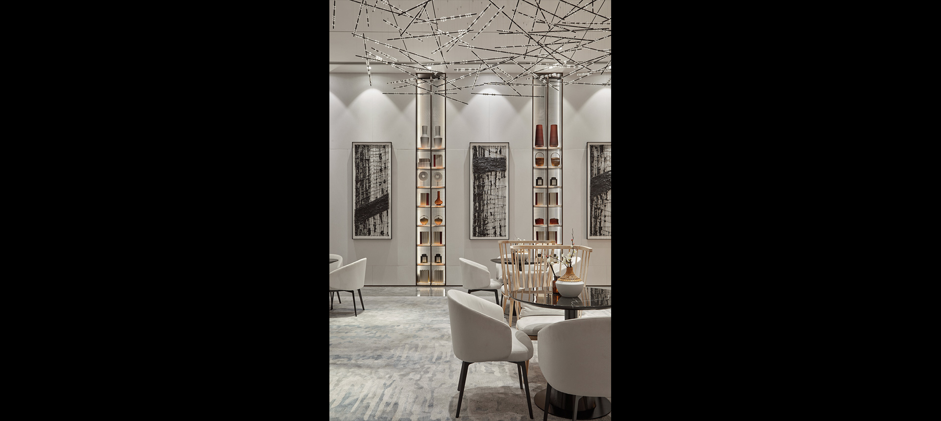 接待厅以深色的基调渲染静谧内敛的空间氛围,一片片手敲红铜交错铺陈光影斑驳,勾勒出意匠的气韵。