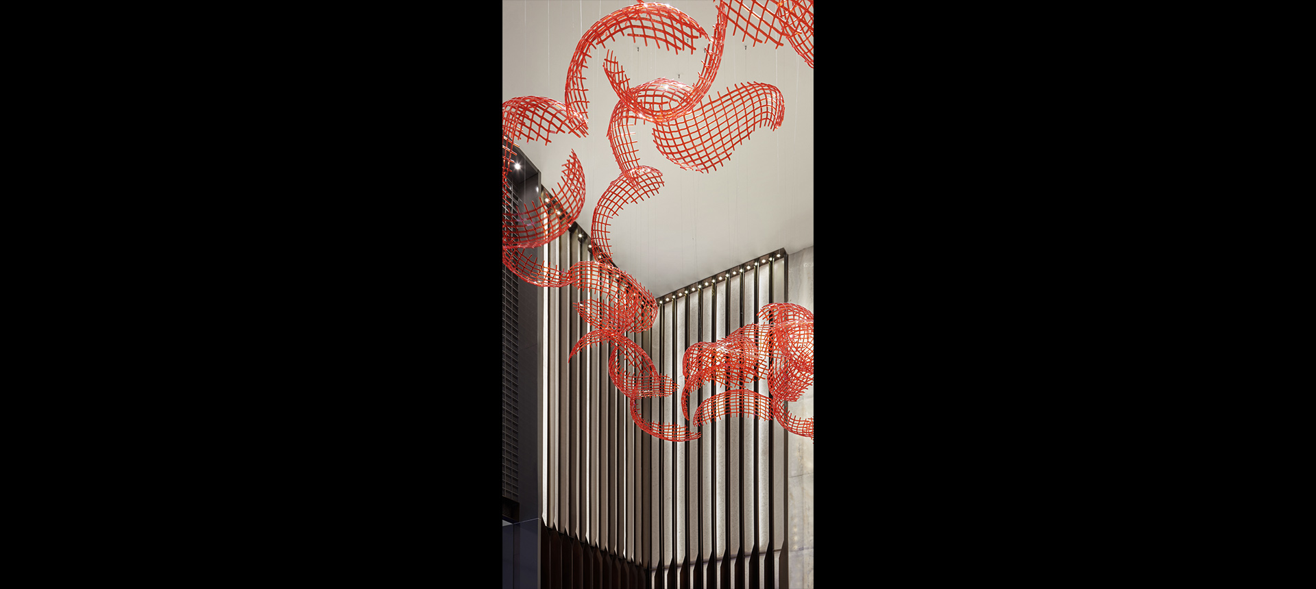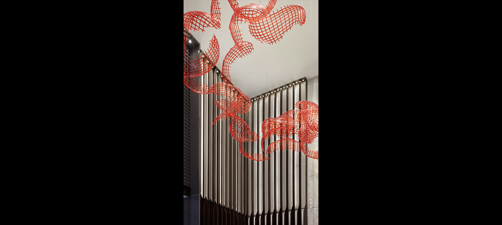 惠州非物质文化遗产—龙门林村盒箩制作工艺,亦是本案设计灵感的主要来源,设计师提取了对盒箩的编制印象展现于室内,如悬于半空的装置品,是采取具有现代感的透明亚克力材质利用热弯工艺制造而成,形似盒箩编制物品,用设计语言重温这份有温度的传统手工技艺。
