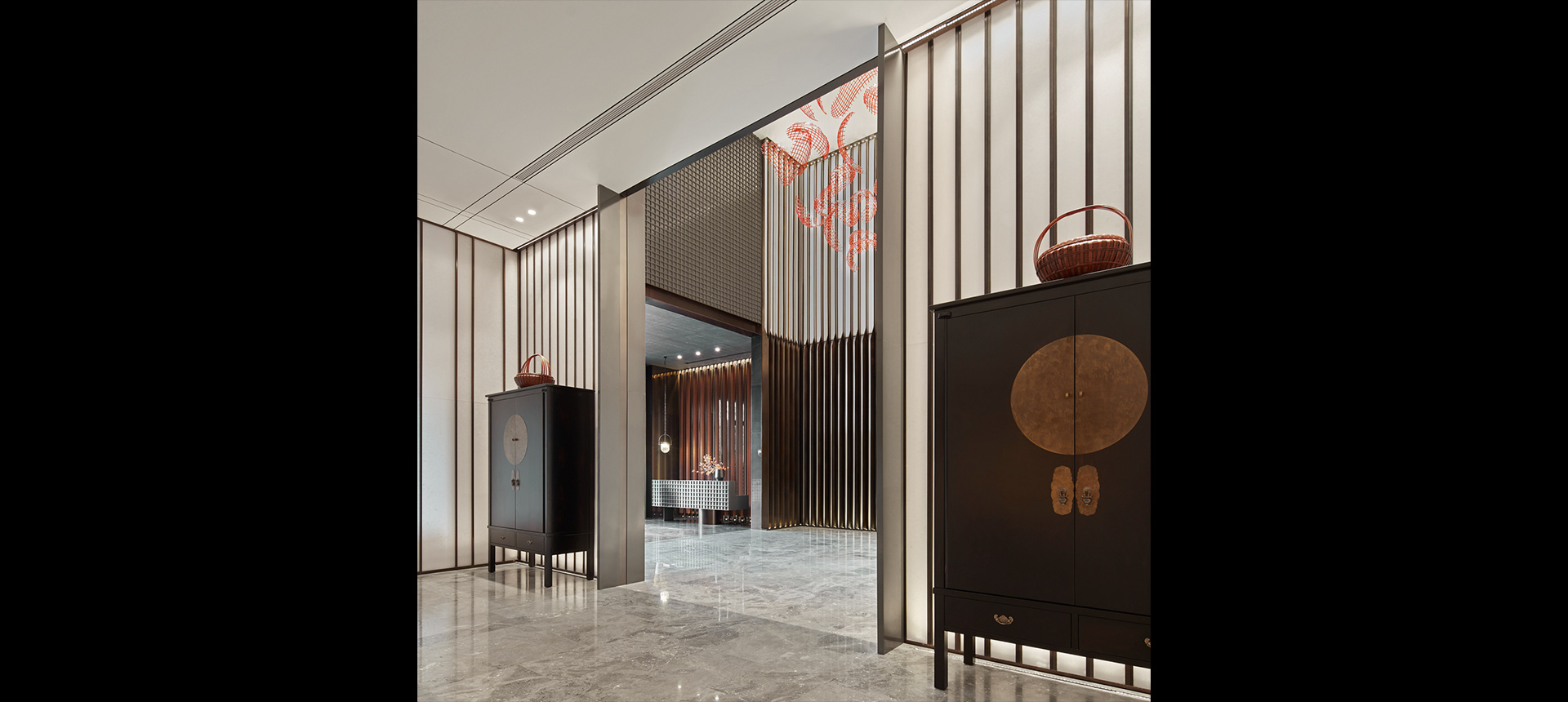 与接待厅形成鲜明的明暗对比的艺术过厅,使人们进入后,有豁然开朗之感。古铜钢和透光材质交织而成的墙面,阴阳相生一气呵成,呈现出尊贵府邸的不凡气度。