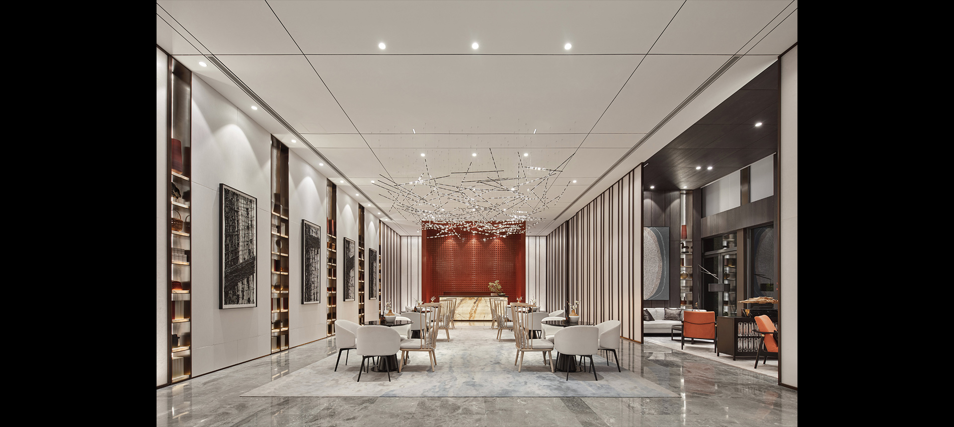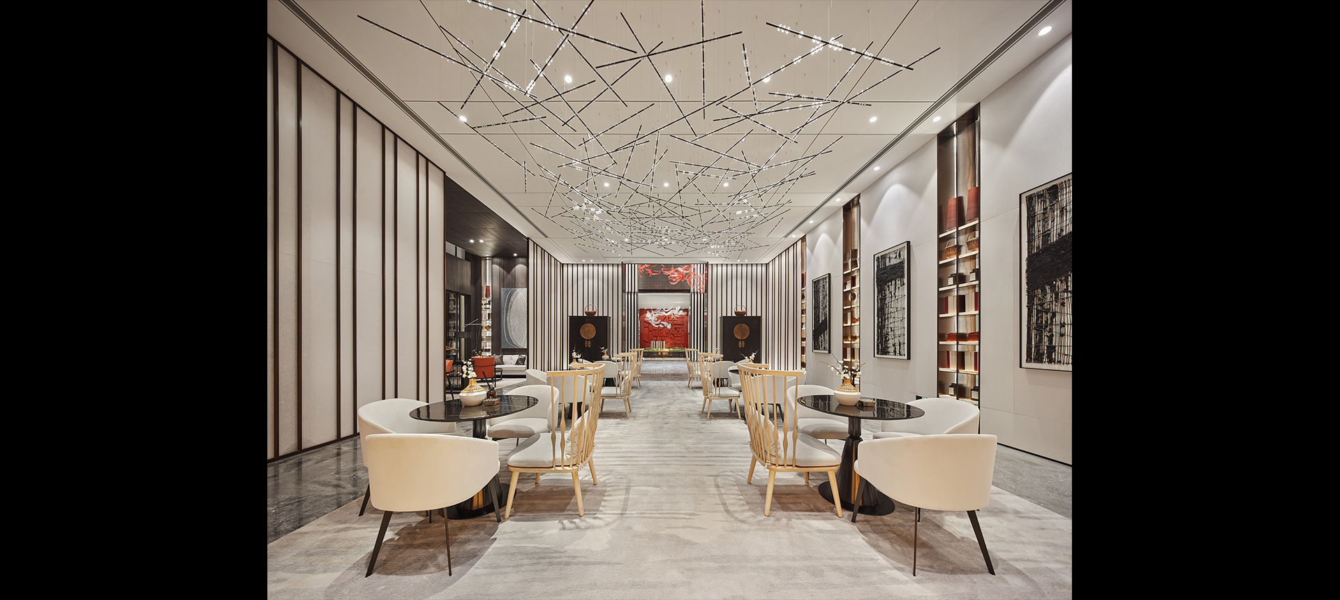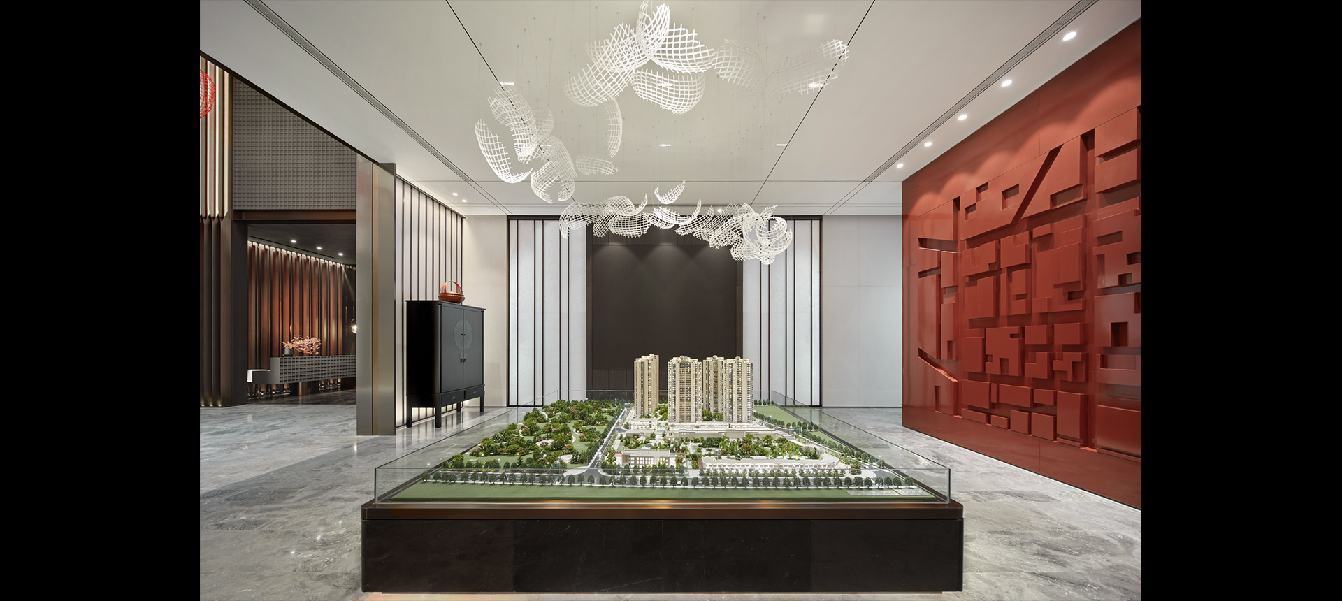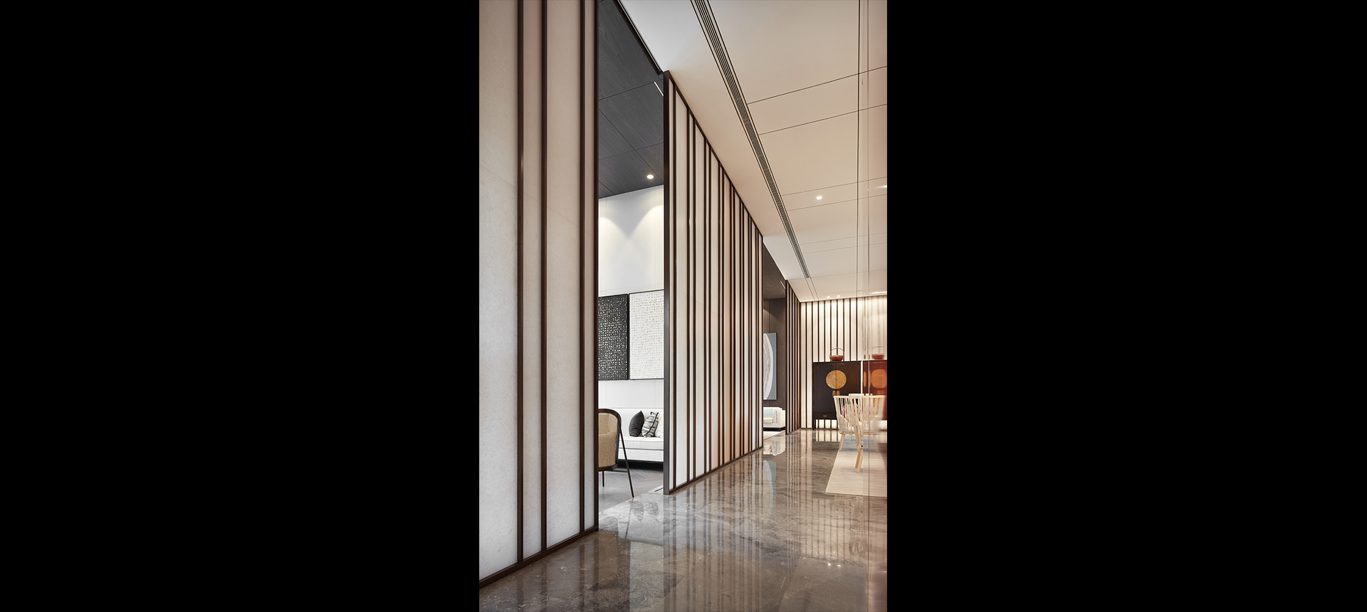 在营销中心的设计过程中,李益中空间设计尝试将惠州的山水自然和当地人文,通过设计手法的转译和表现,去融合现代的简与艺术的雅,力图使整个作品的光影、材质、意境革新,从而塑造出“俊逸灵动、润雅圆融”的气质。