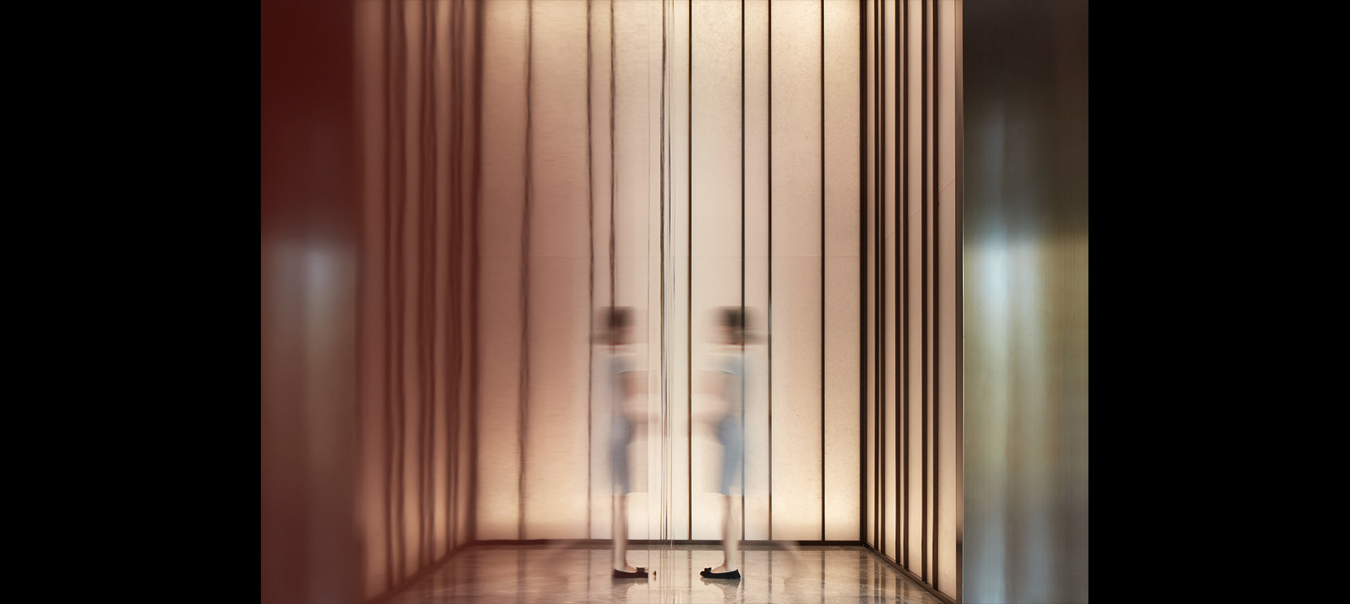 通往室外的过厅,用拉丝古铜塑造了一个简洁的半弧形框架,内部同样通过透光材料搭配情景光源,影响其透光率的变化,产生远近不同层次的光影效果。
