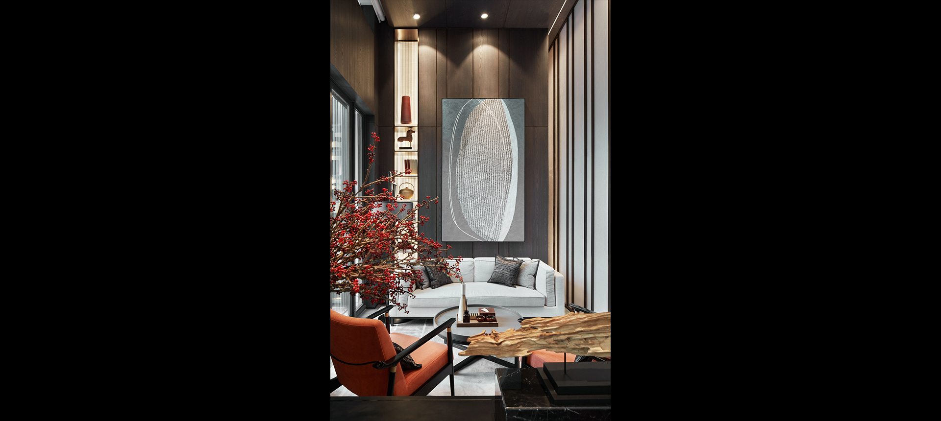 沉郁素朴的深色界面围合了一个半私密的体验空间,儒雅的米白色沙发,穿插灰蓝色和橙色来调节室内氛围,丰富内部层次。