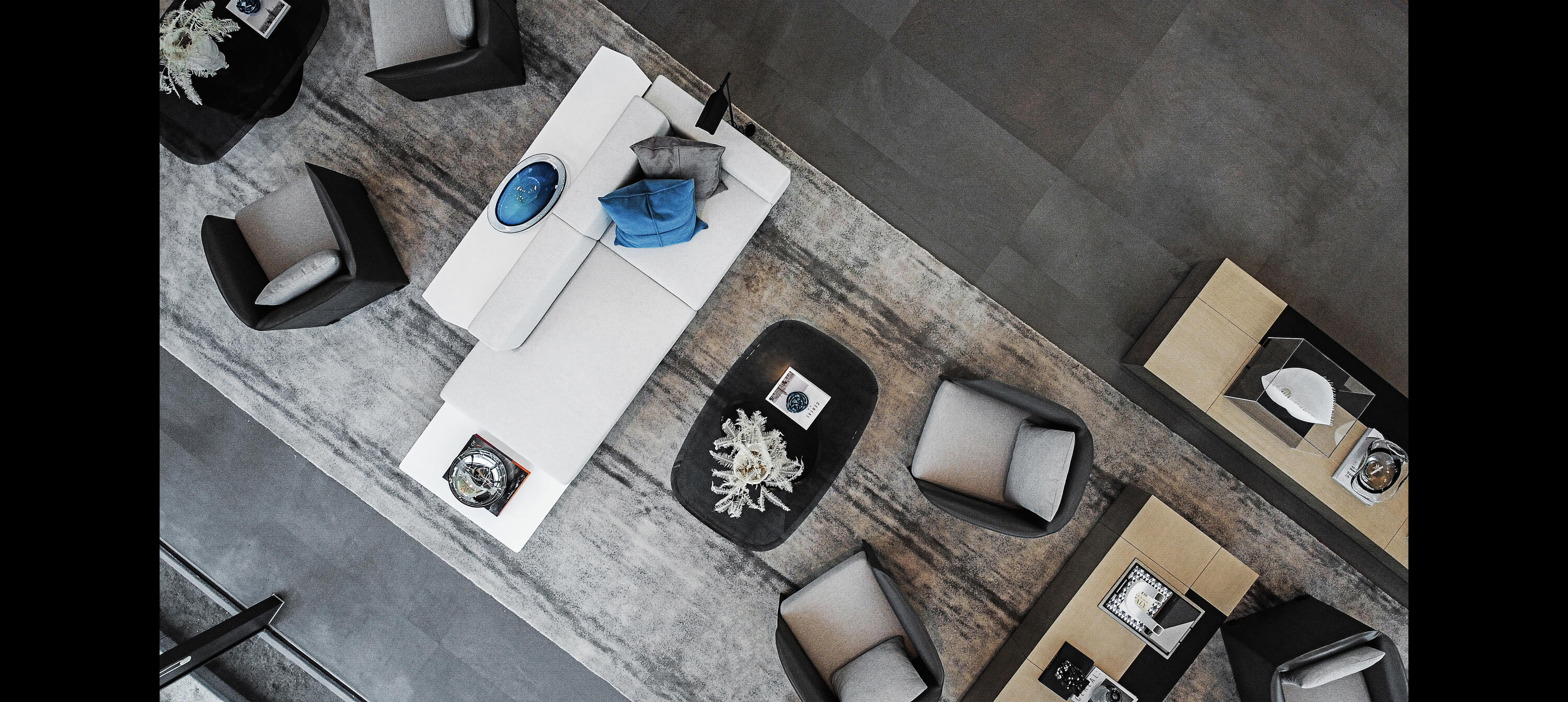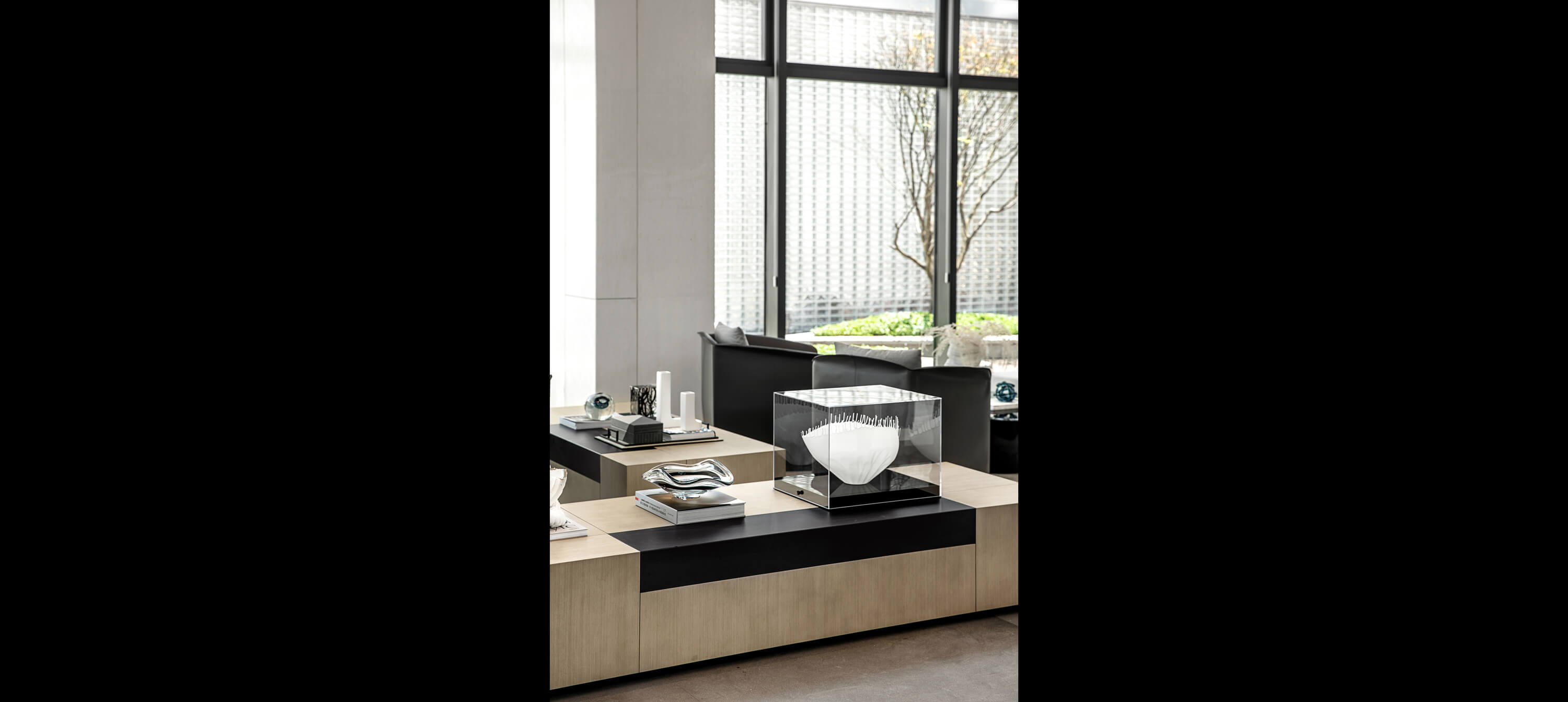 The black geometry of the background wall of the sand table area and the linear lighting above form a contrast of massiness and lightness.