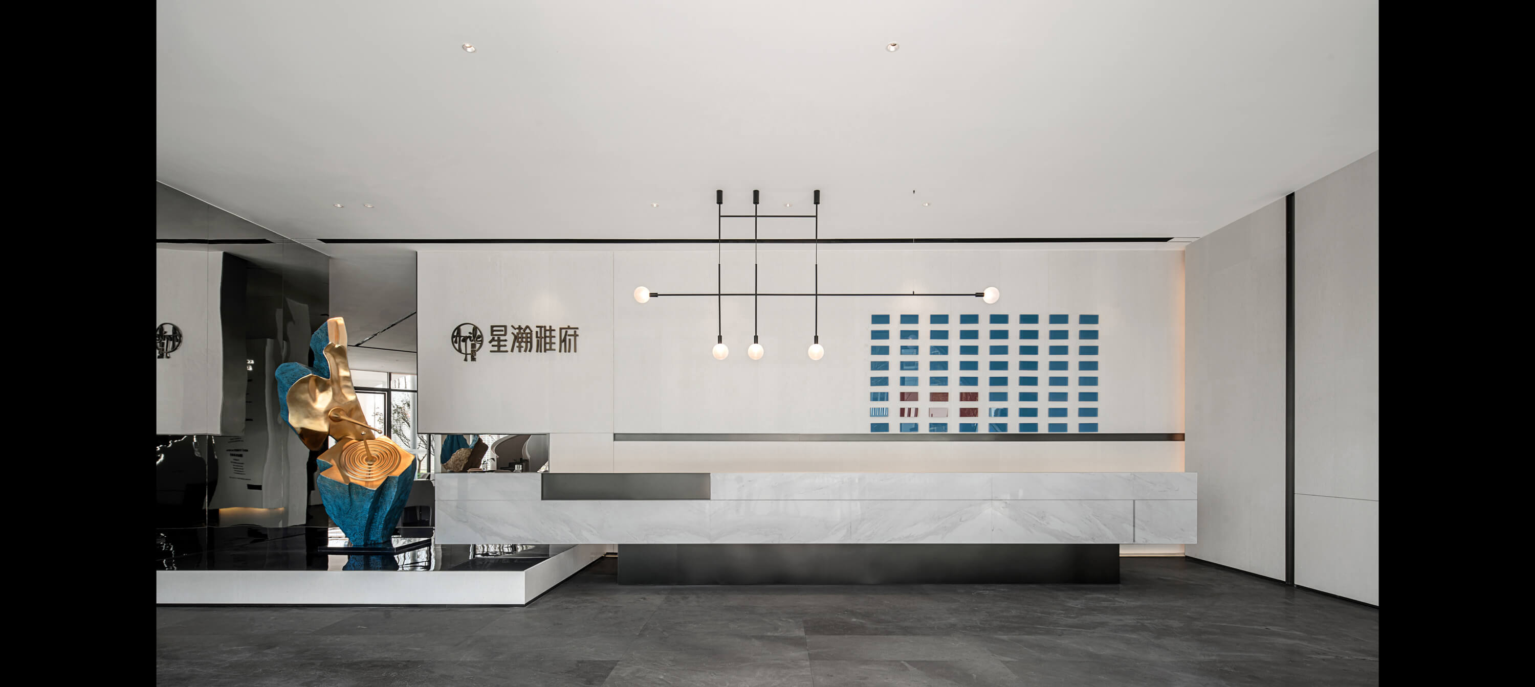 沙盘区背景墙黑色的几何体块与上方的线型灯饰构成厚重与轻盈的对比。