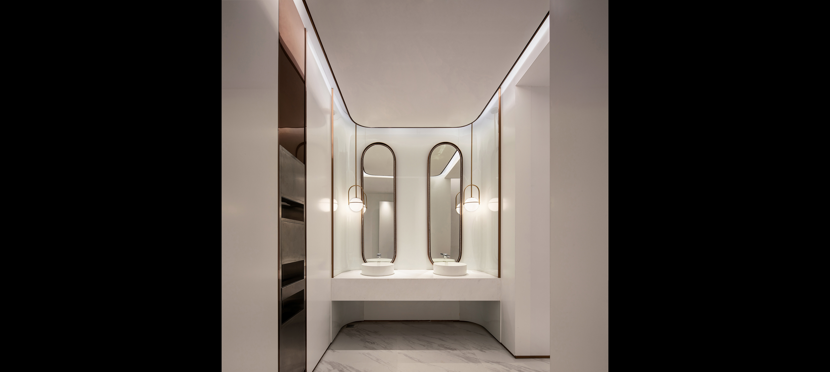 在空间的入口处,设计师运用流动形态的曲面代替了以往的直线型体块,以铜板材质呈现,增添了空间的现代时尚气息。整体设计上,以浅色调的大轮廓,包裹着色彩浓郁的小空间,在弧线艺术的延展下,赋予其俊逸灵动的层序美。