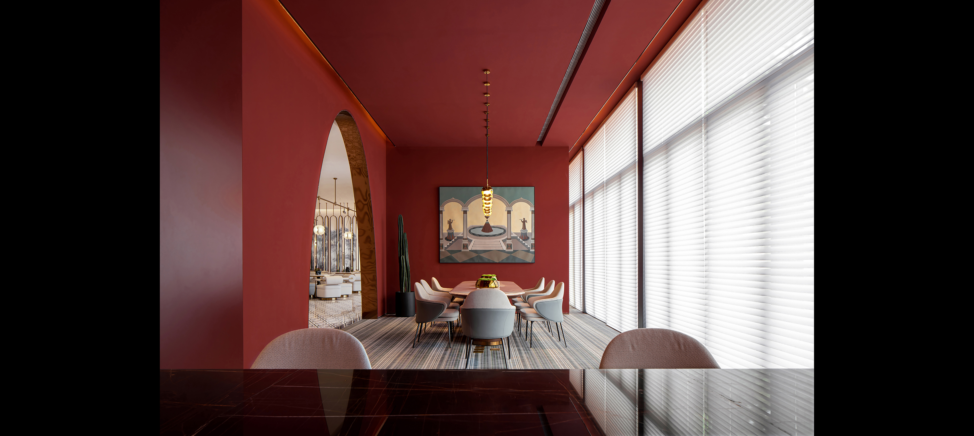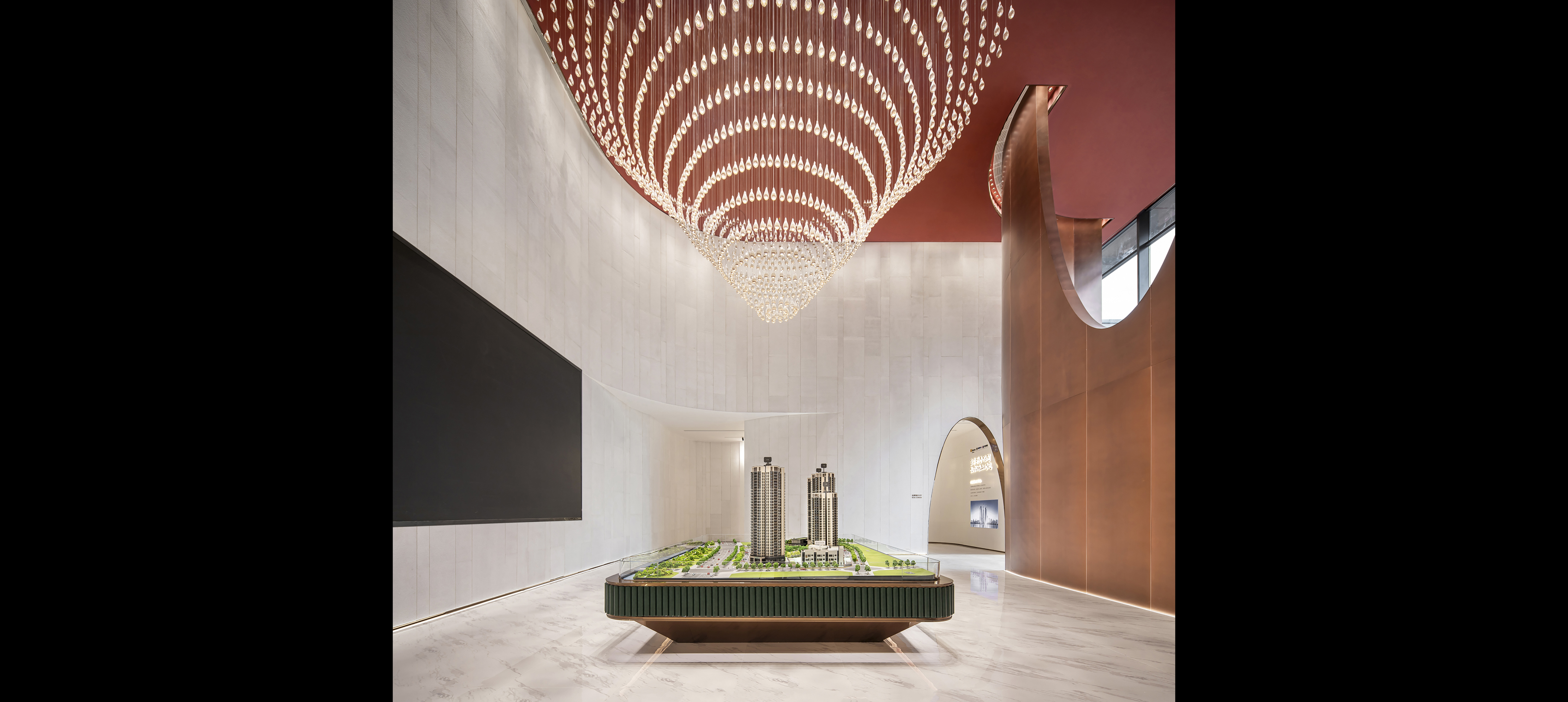 大小、形制不一的弧线拱门,延续了视觉上的艺术纵深感,串接起沙盘区与各功能区的关联点。在细节上,设计师以有趣的色彩、简约的形制、精致的灯饰点缀空间,烘托出润雅圆融的艺术气息。