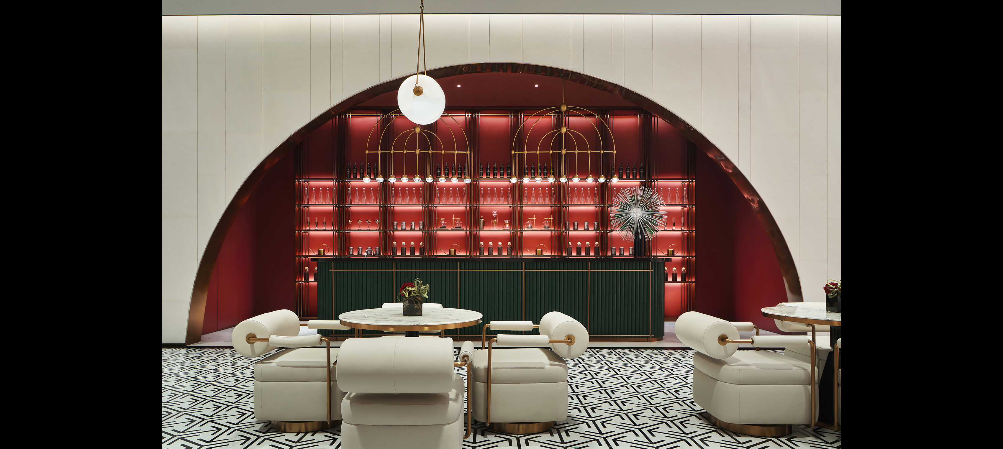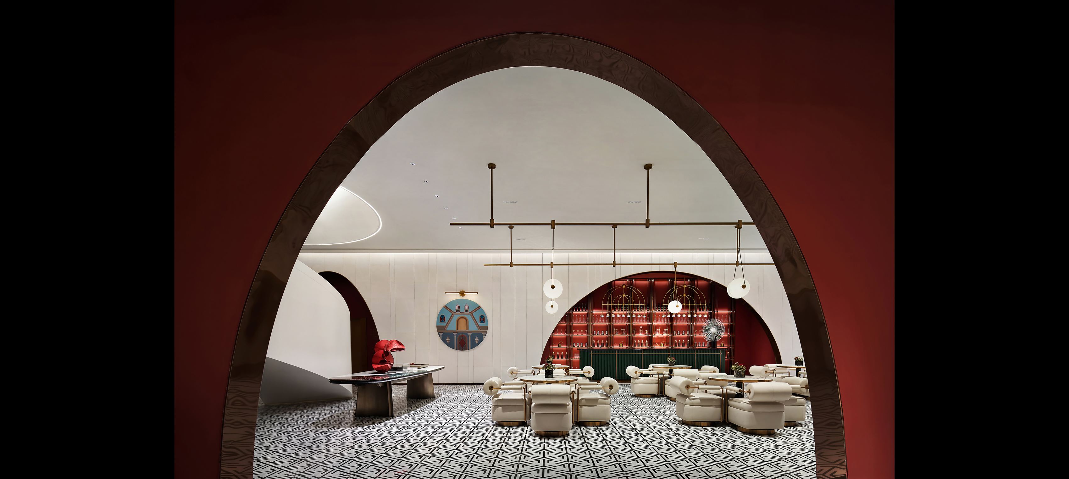 透过半月形的拱门探至水吧,红绿二色的碰撞在空间中形成了别致的韵脚,以一种源于色彩、肌理、材质的外在表现形式,为人们带来当代美学的创新视觉体验。朦胧的光漫映其间,气质悠然而淡雅。