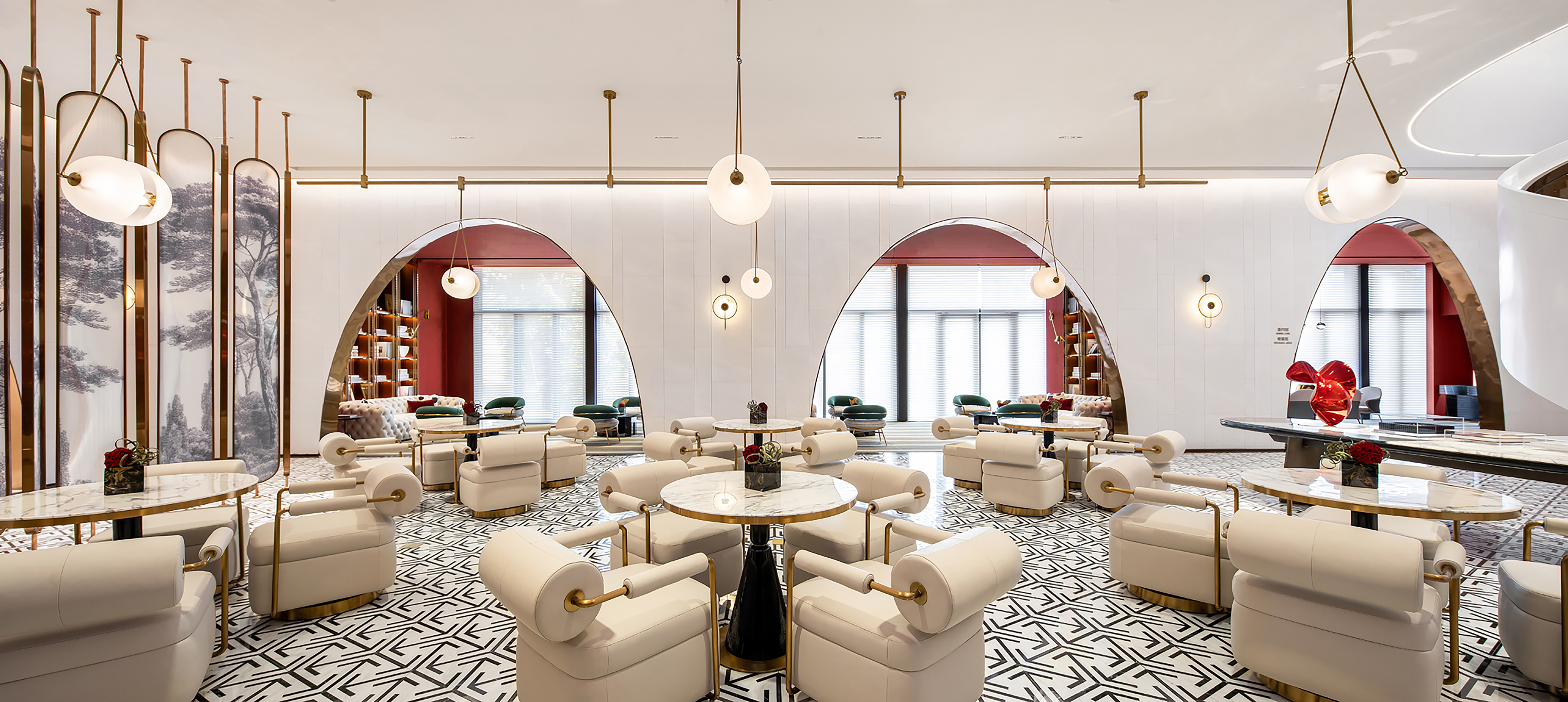 一个半月形的拱门对应一个独立的深度洽谈区,围合出相对安静而私密的场域,对景窗外的自然,令人联想至“幔逗长风细,窗留半月斜”的意境。设计师以一种当代语境与艺术主题的交融,令空间在无处不打卡的社交场域与无处不自由的精神场所之间切换,铺叙生活本质与美学意涵。