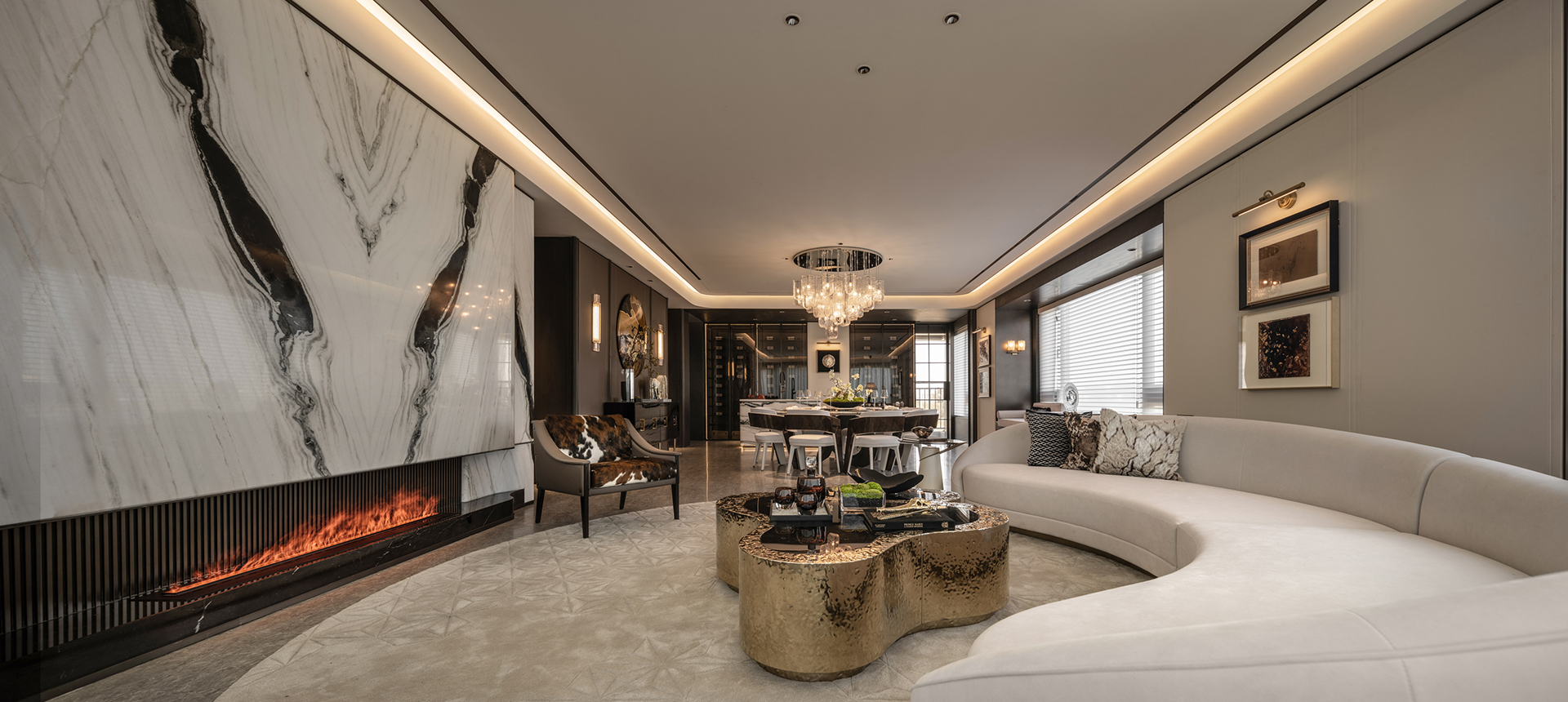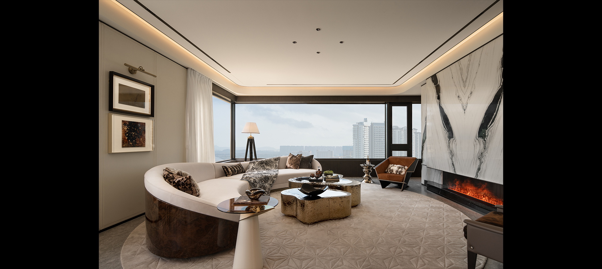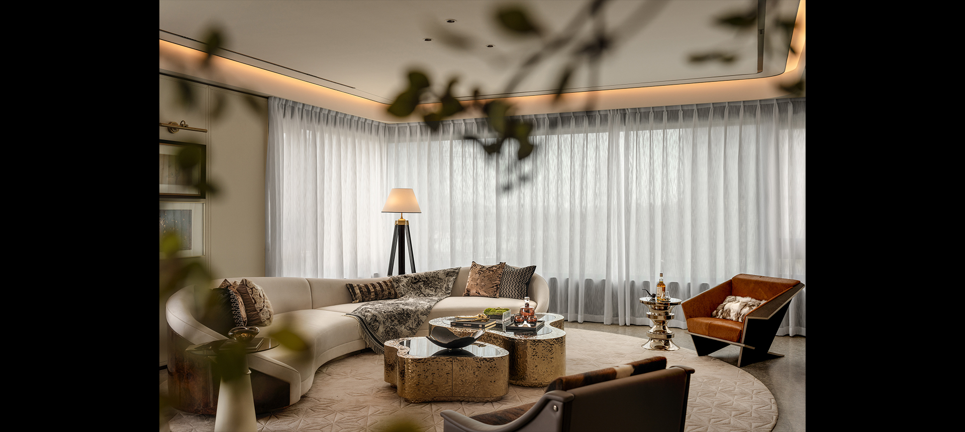 客厅的弧形沙发在开放式的大厅内自然地围塑出休闲区,视野开阔,活动自如。弧形的流线给方正的边厅内加入柔和的视角,更为温和近人。家人之间更为聚拢和贴近,营造更亲密的社交距离。