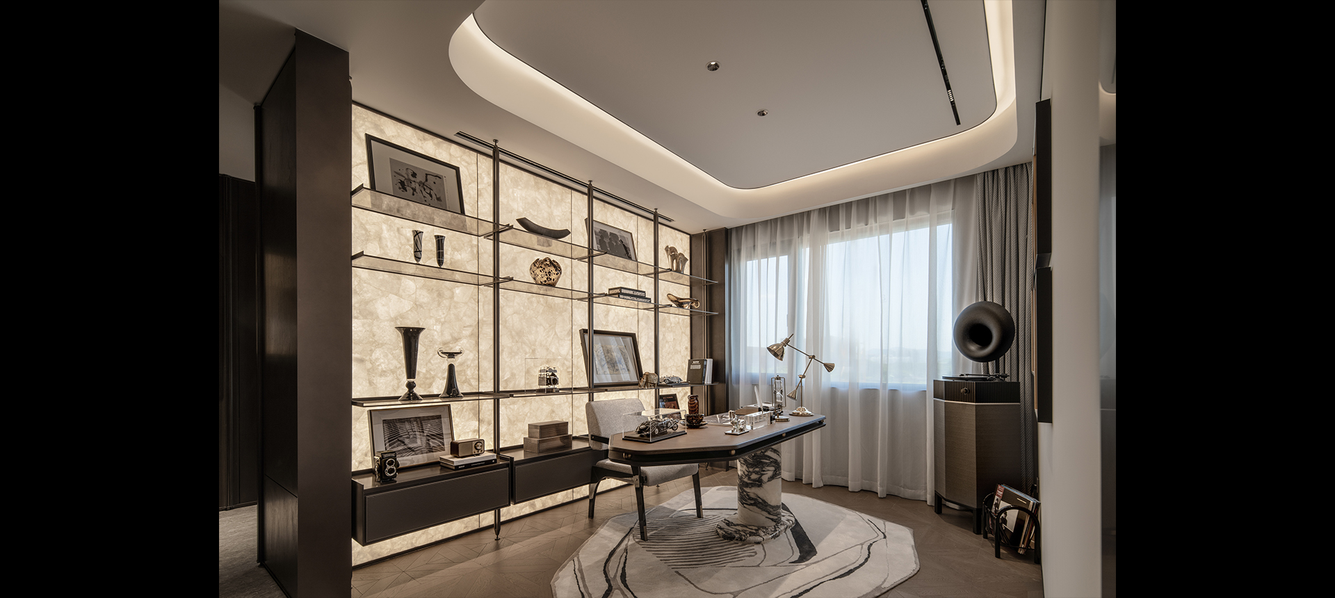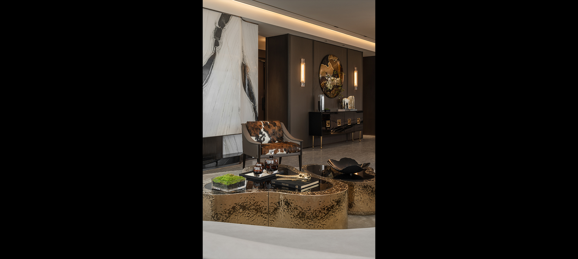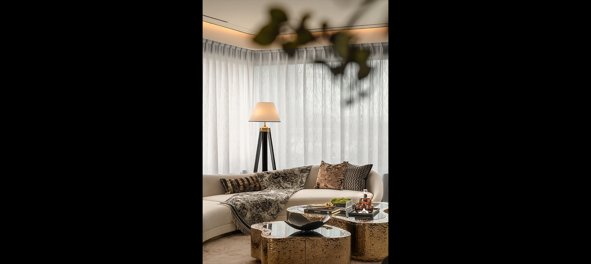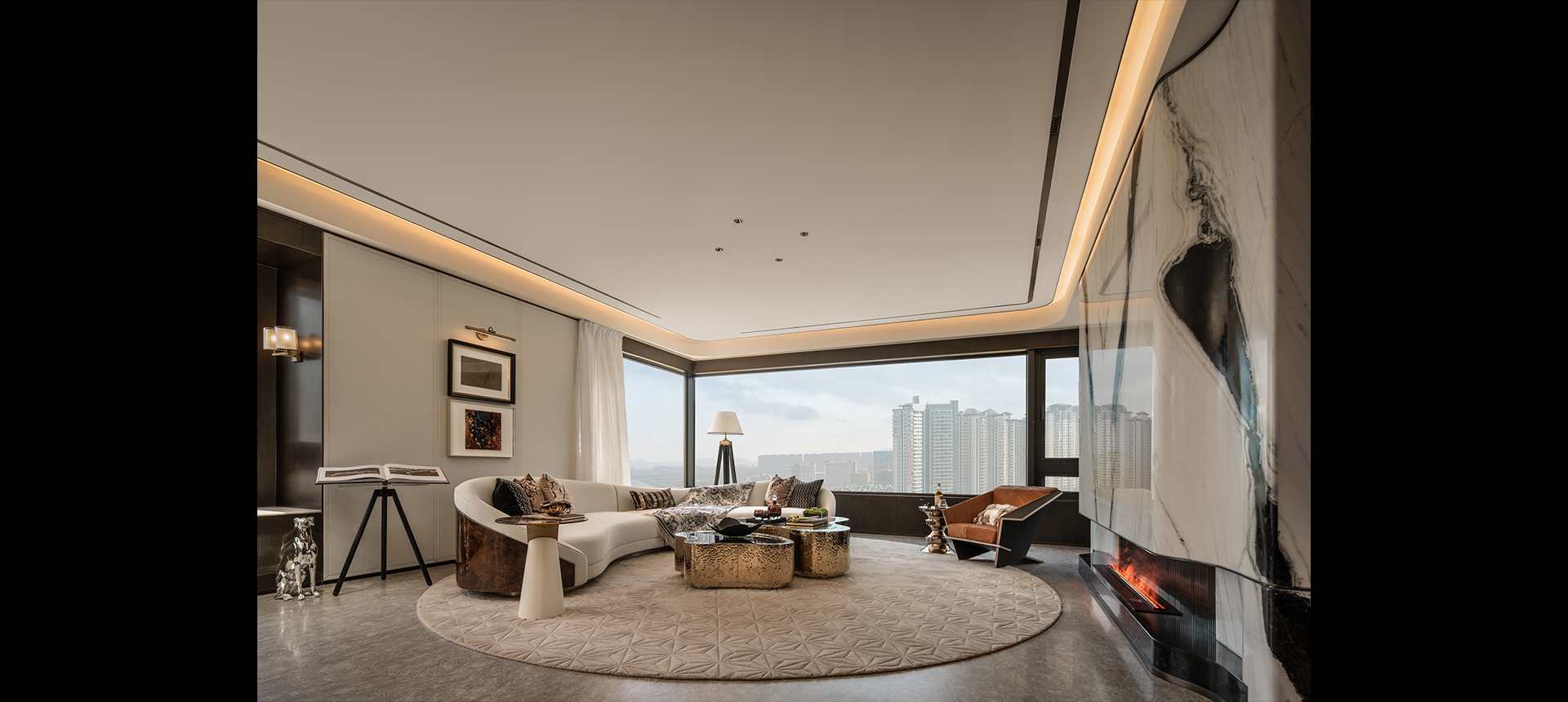 客厅的弧形沙发在开放式的大厅内自然地围塑出休闲区,视野开阔,活动自如。弧形的流线给方正的边厅内加入柔和的视角,更为温和近人。家人之间更为聚拢和贴近,营造更亲密的社交距离。