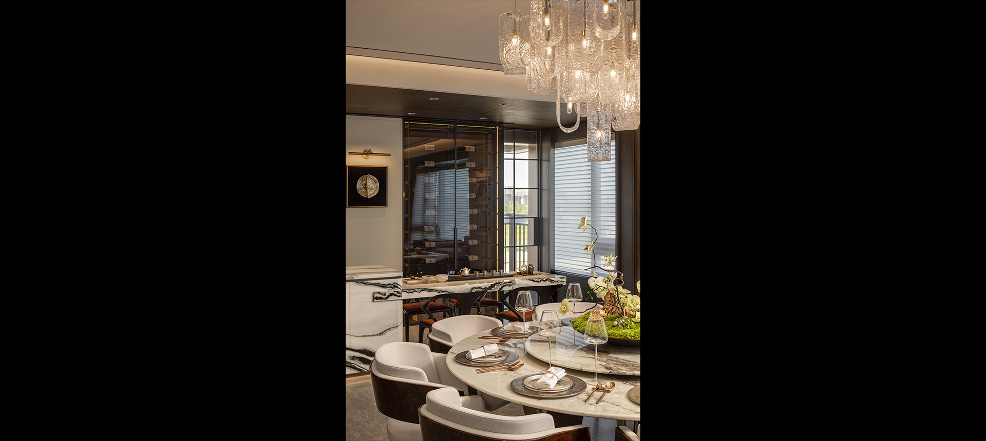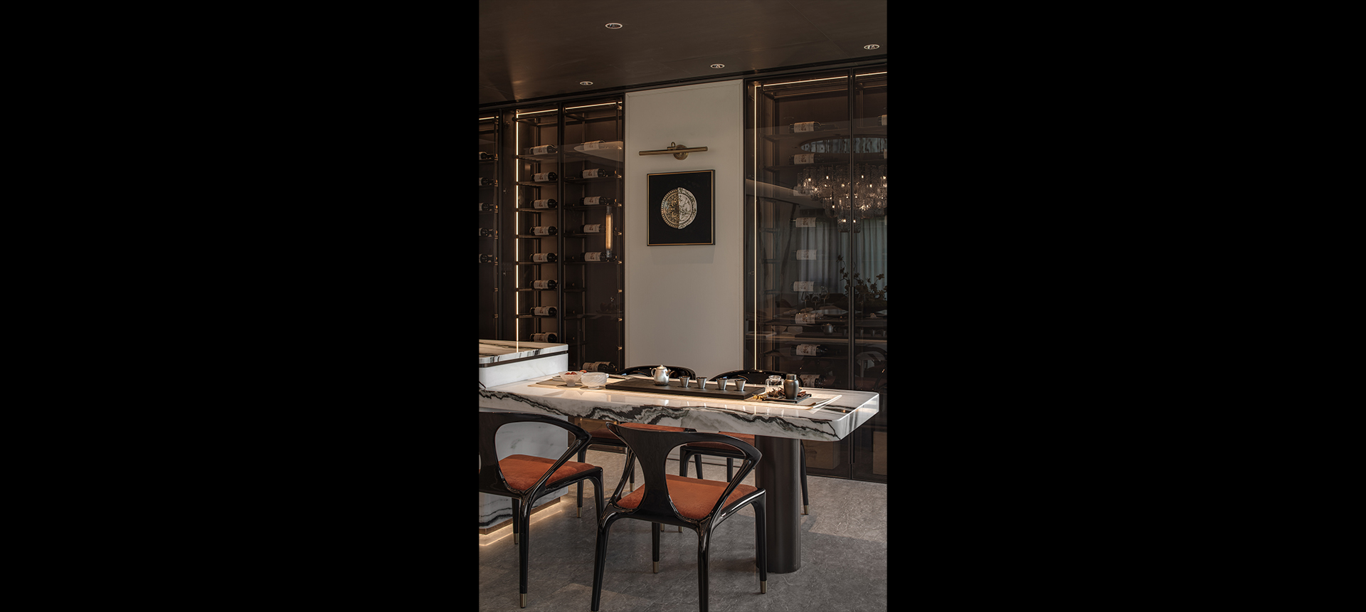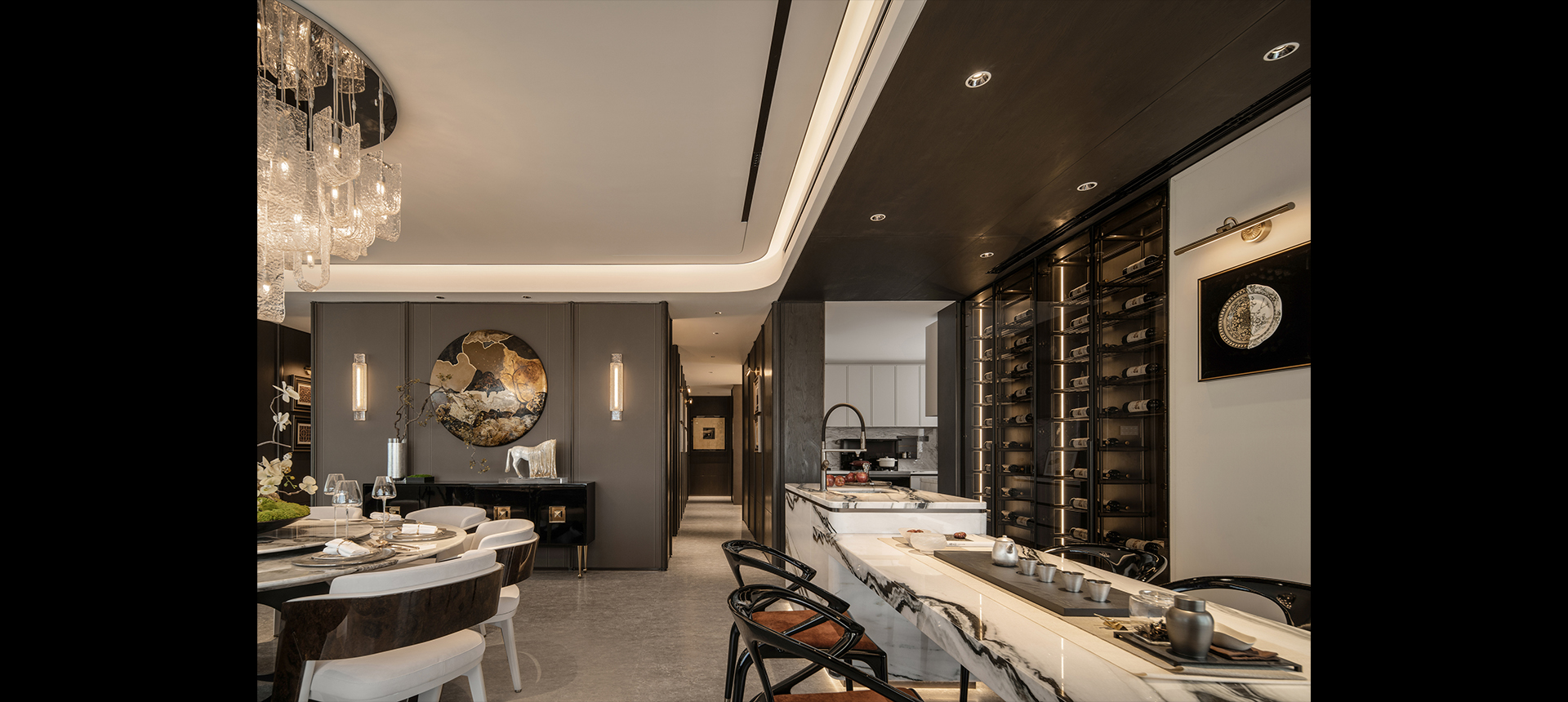 开敞的西厨与中厨有机结合,并设有多功能桌。提供一个区别于正常空间的社交场所,可聊天、可饮茶、可桌游…… 令空间更具灵活性,融于生活、融于社交、融入风景。佳宴必有美酒,吧台、酒柜等由酒延展的构件体现其自身具备的收藏与展示属性。