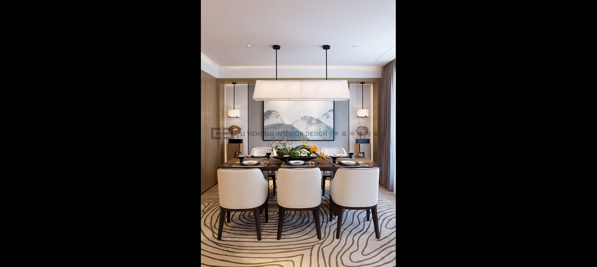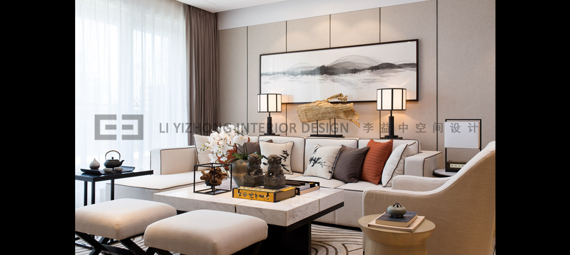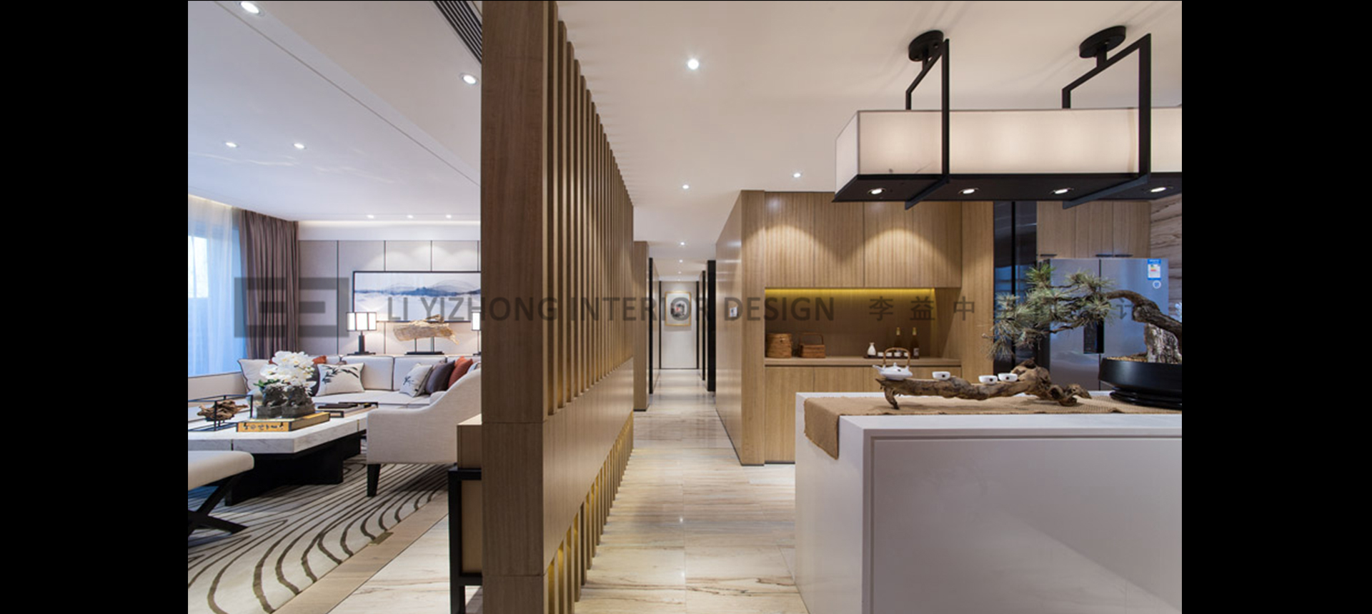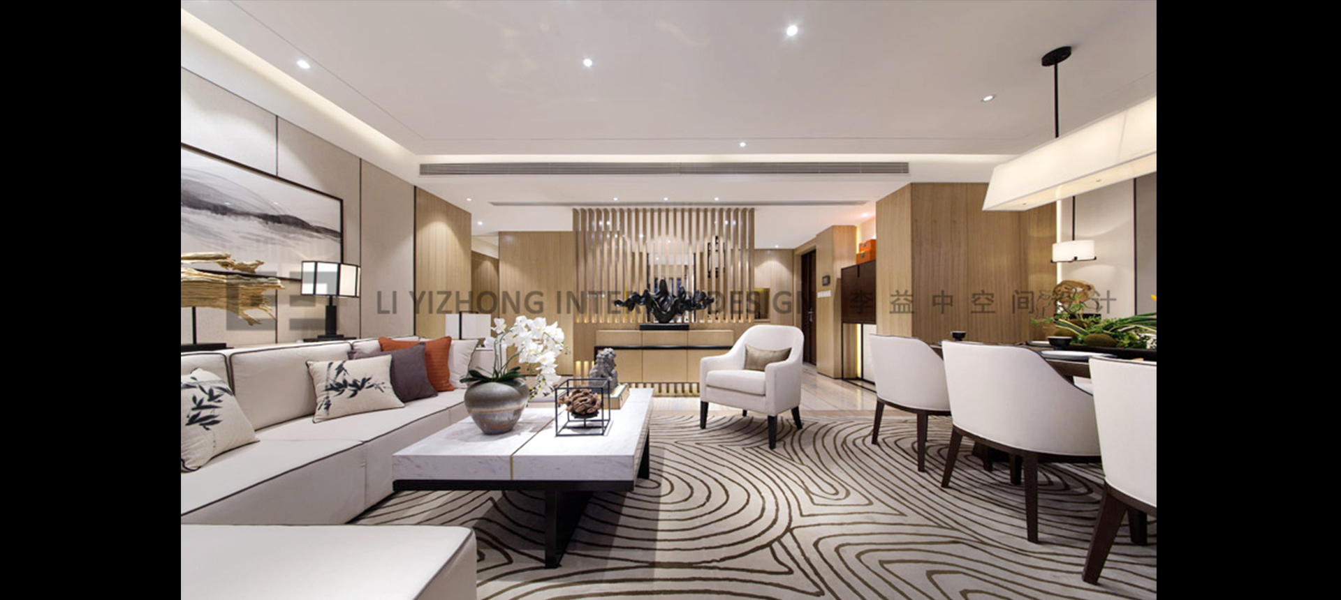 The semi-open bar with the wooden partition brings space a sense of order and sets off the landscape arts, which plays with the effect of finishing touch. The living room with perfect symmetry has exquisite and simple lines, covering carpets with dried mountains and rivers on the floor. We express idea with the shape, and express emotion with the idea.