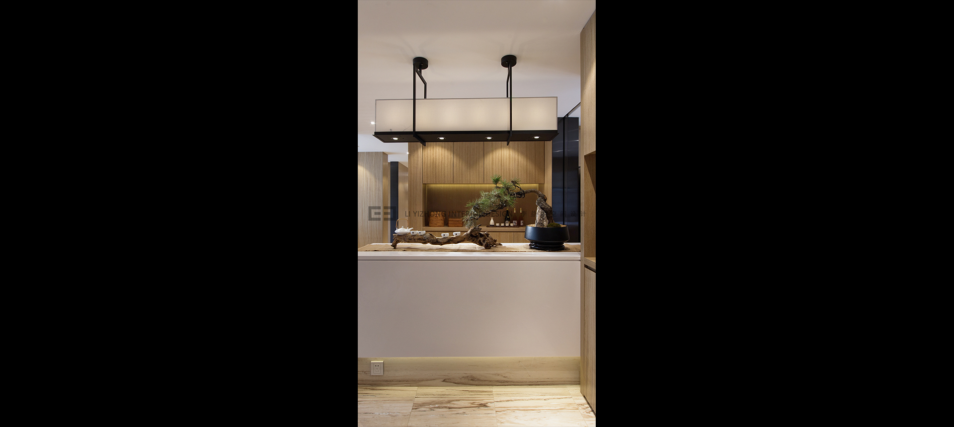 吧台半开放隔断强烈的秩序感,映衬画龙点睛的造景艺术。客厅完美的对称,细腻简洁的线条,形似枯山水的地毯,以形写意,以意传情。