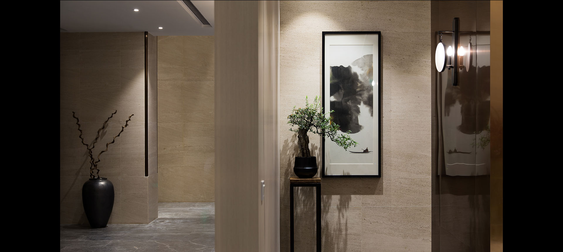 在深色石材的衬托下,空间呈现出丰富的层次感。于此同时,我们搭配了光洁的瓷器和精致的玻璃,让其产生对比,既增加了空间材质的多样性,也使得空间越发沉稳内敛,精致优雅。