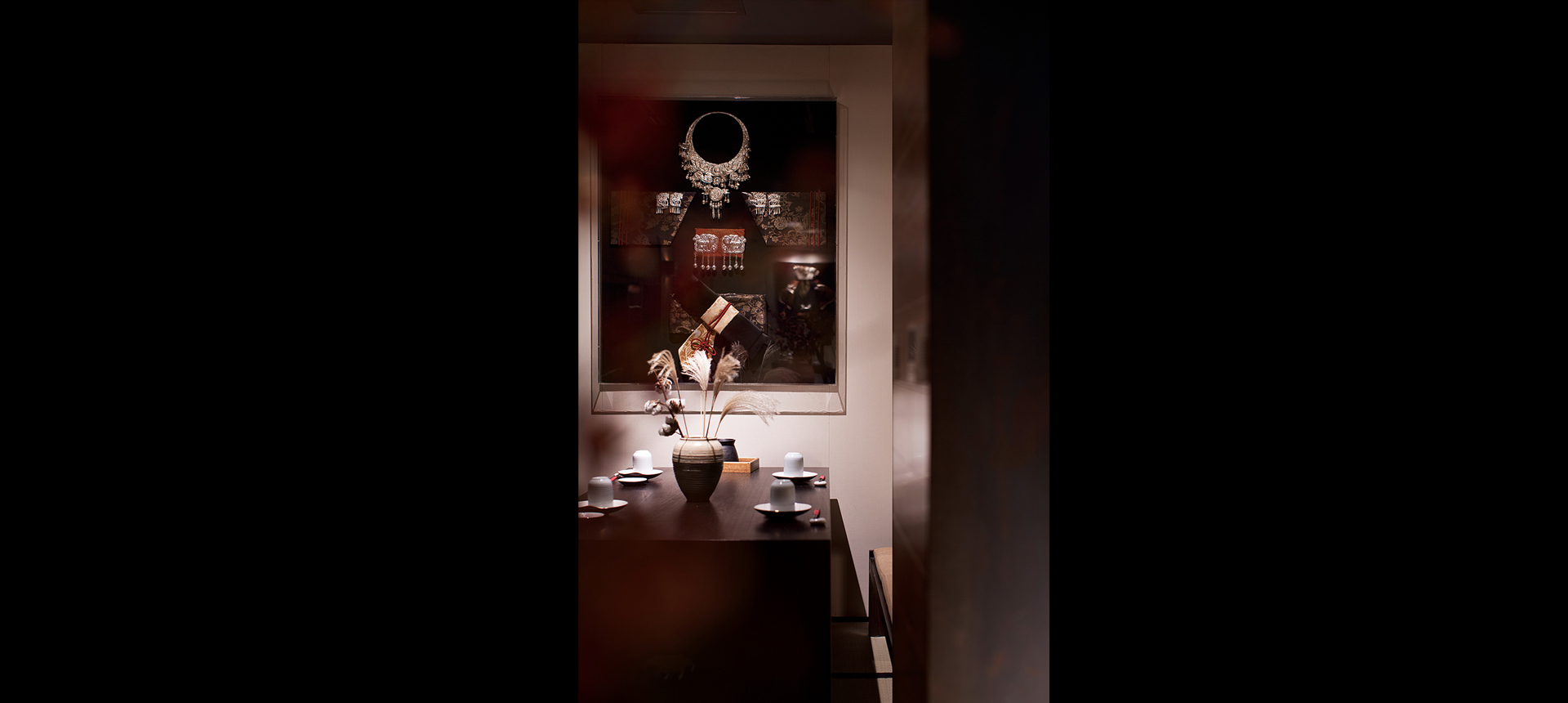 陈设设计是室内设计的重要一环。陈设的灵感来源于我们的陈设总监旅行时拍摄的一张图片,此图片表现的是几款日本的服饰,个中蕴含了许多中国的元素,比如苗族服饰中的银饰贯头衣,及红黑白黄的色彩,都转化成为本案的陈设要素。