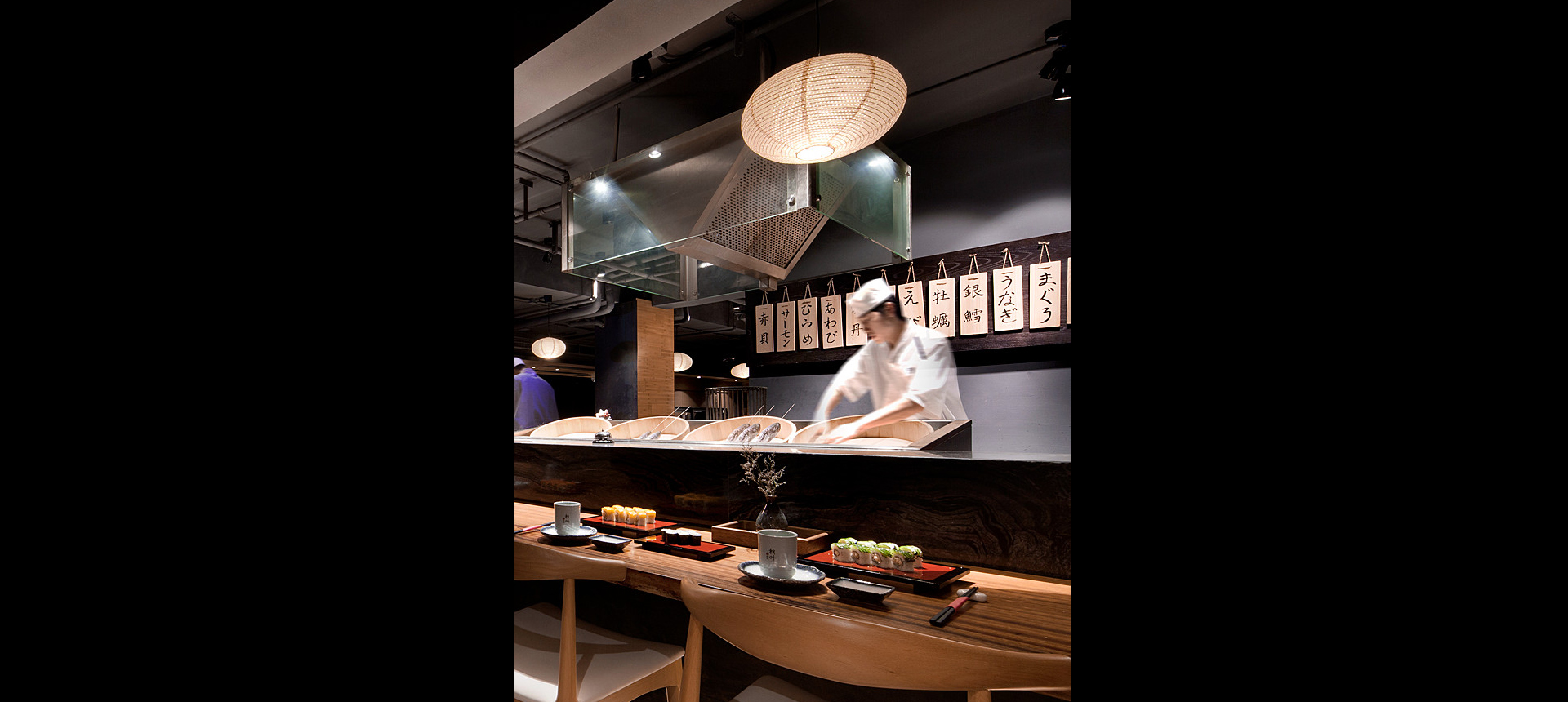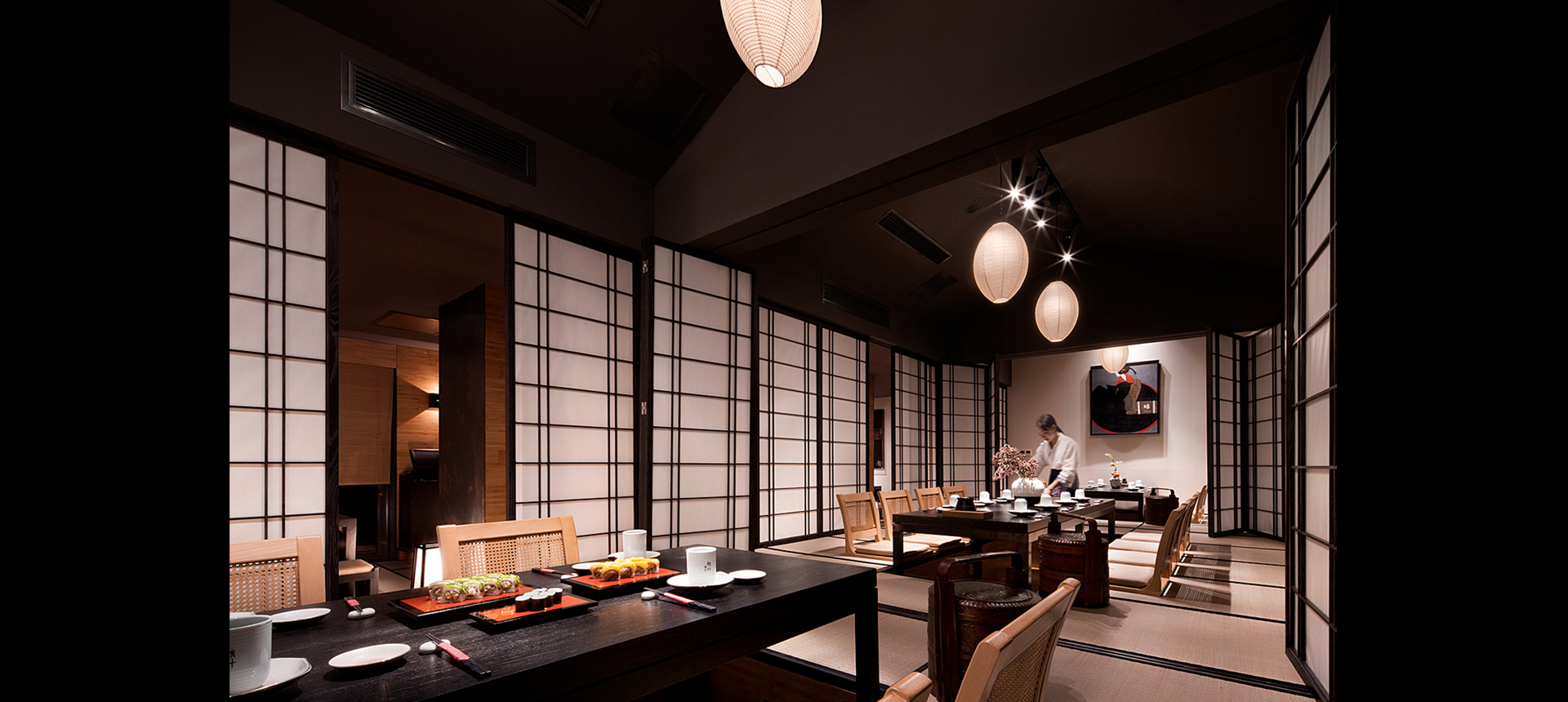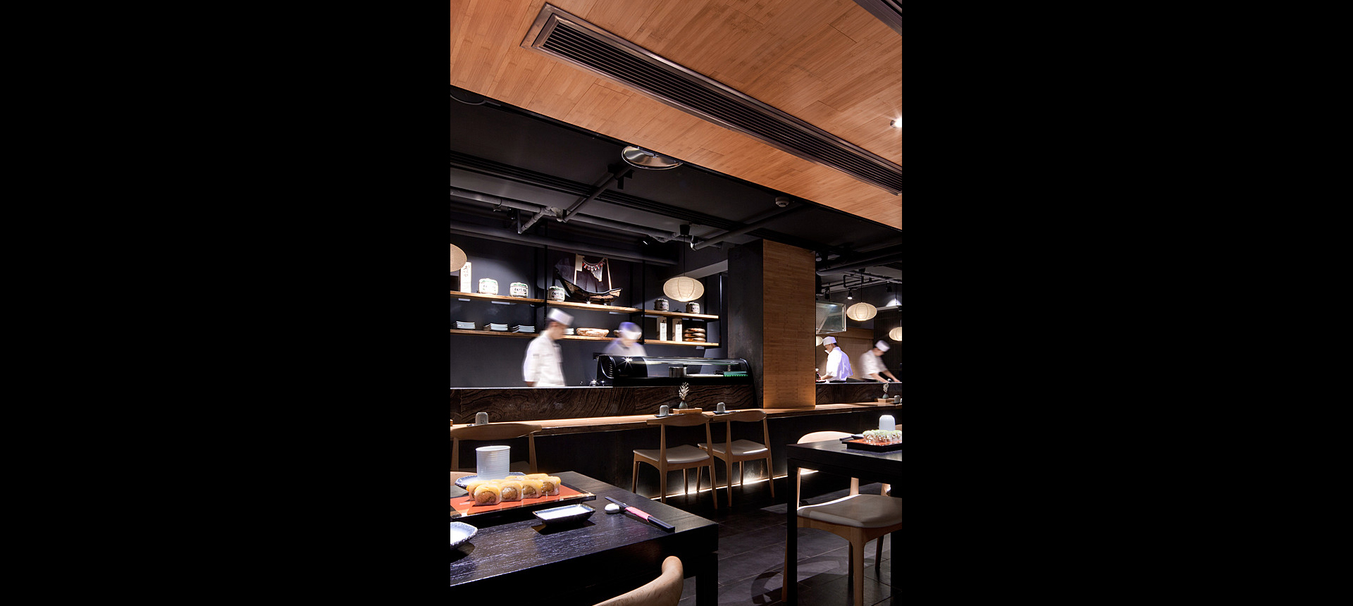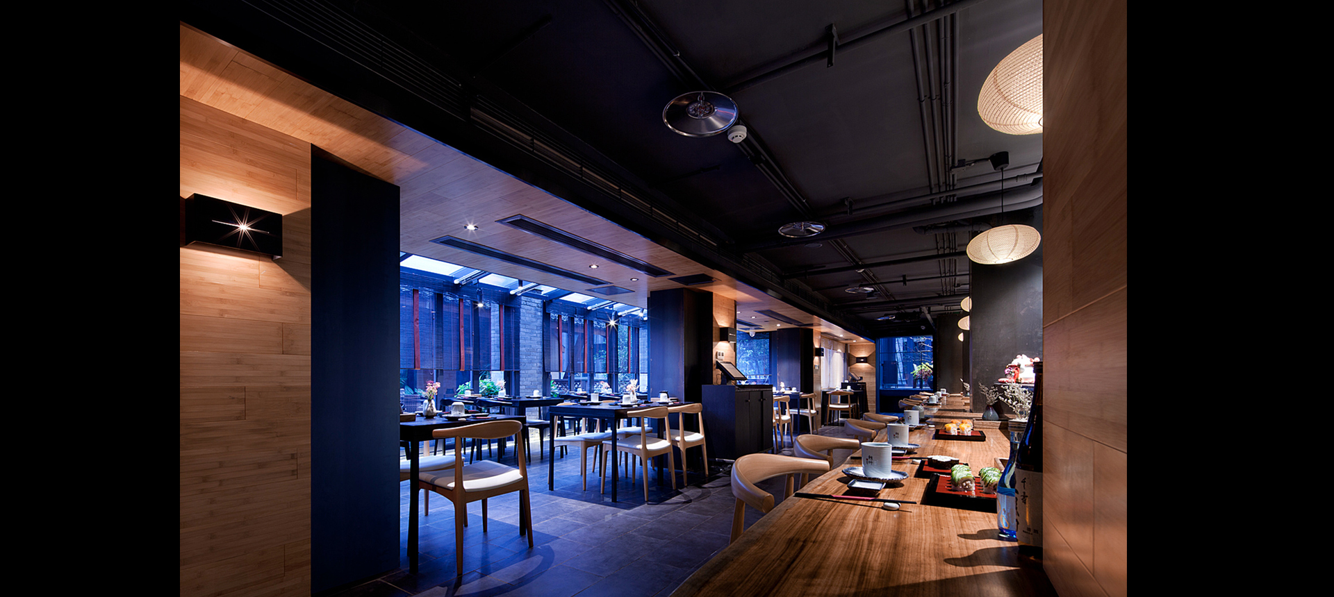 这是一个日式餐厅的设计。通常的日式餐厅设计一般采用和式的符号语言(比如榻榻米、障子门、和纸等)来装饰,这是简单又行之有效的设计手法,但显然有些传统。若加入更加简洁现代的处理,在气质上做文章如何?