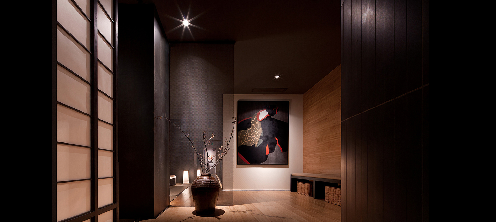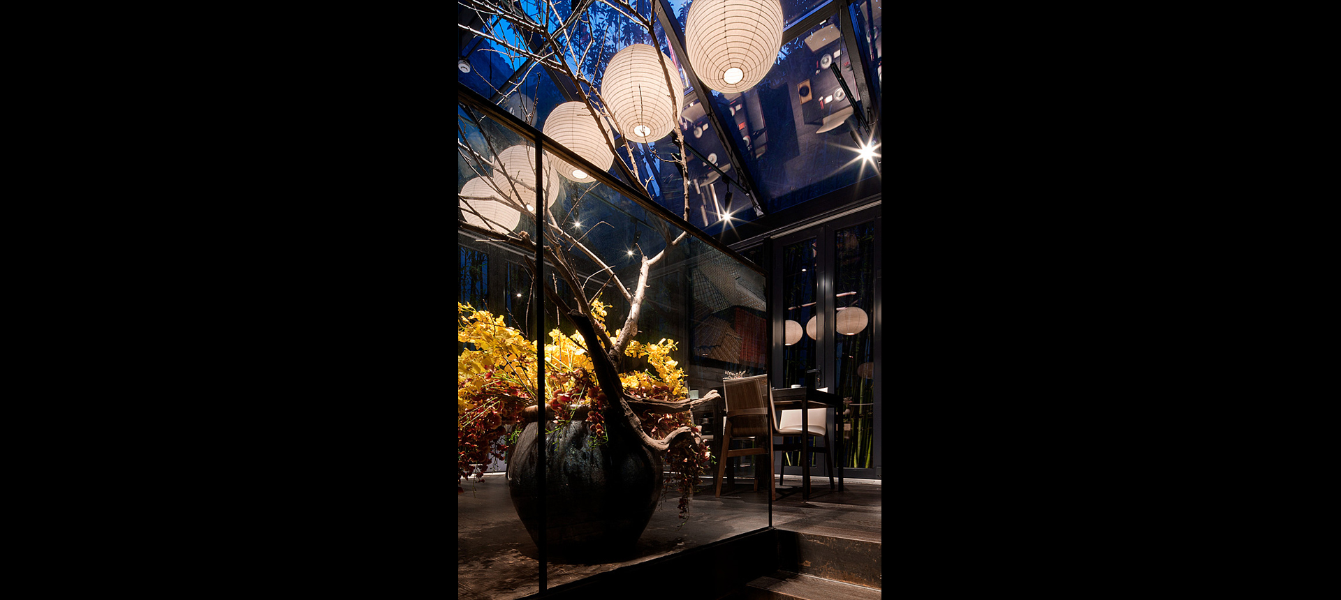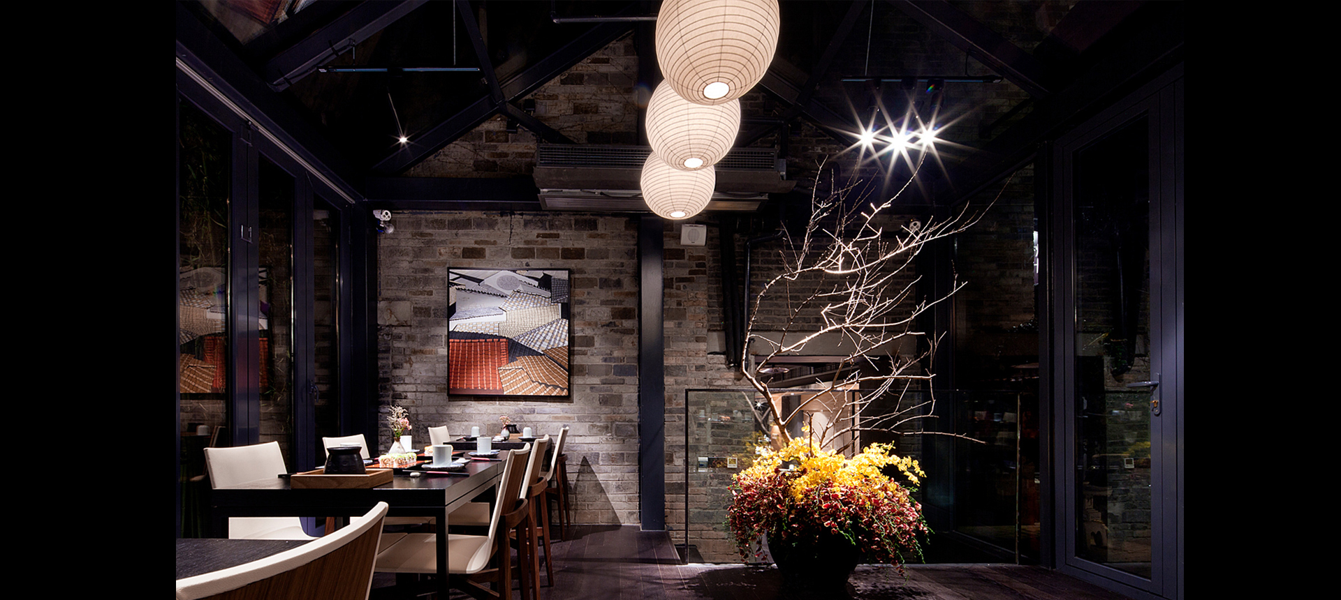 阴翳之美就是一种气质之美,也是我们在这个䅁子里尝试表现的感觉。阴翳之美的创造,重在空间的营构及气质的塑造,而不在于形式的繁复雕琢和符号化的连篇累牍。我们尽量让形式简洁,甚至于去符号化,只在二楼包厢保留了可移动的障子门。通过对空间的整理与重置,创造丰富多样的空间体验:吧台区、两个不同比例的玻璃房、二楼榻榻米开放区及包厢;而通过对光的管理和控制,创造光与影的变化层次,创造迷离的阴翳之美。