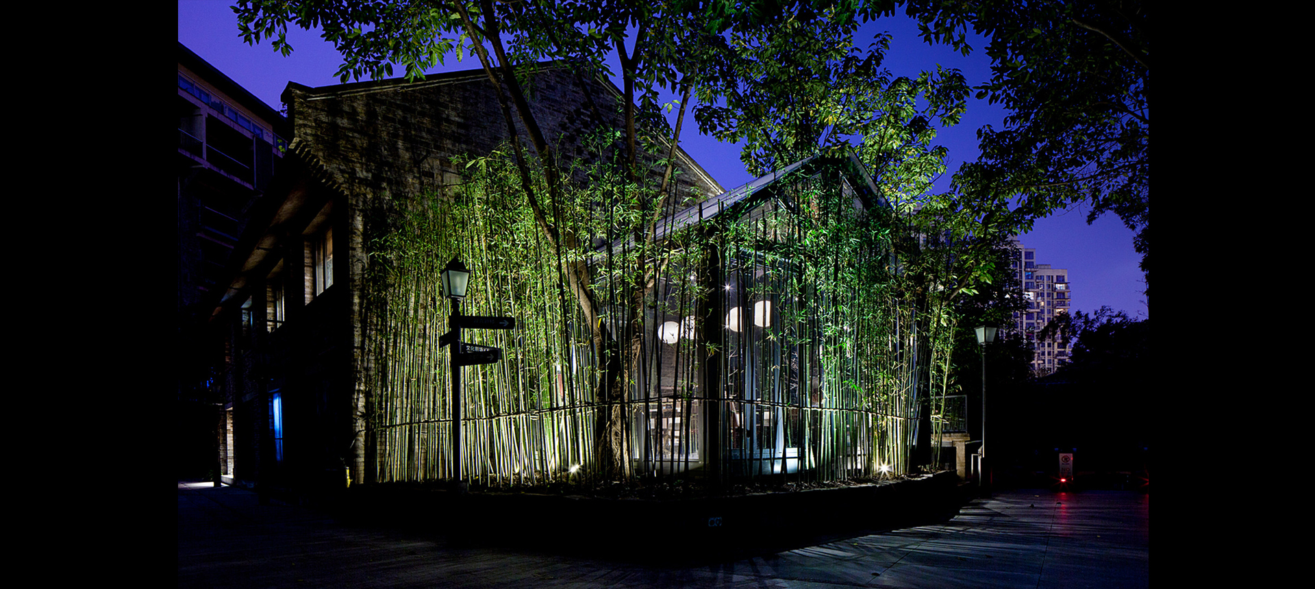 这个餐厅是独立的一栋小楼,与建筑和环境有很多的联系,在设计时除了考虑进入的方式和与环境的互动之外,还充分考虑了室内外材质的对话,尽量釆用了自然肌理的材质(比如竹木地板、实木、青砖等),并用了为数不少的钢板,力图体现一种自然拙朴的精致。