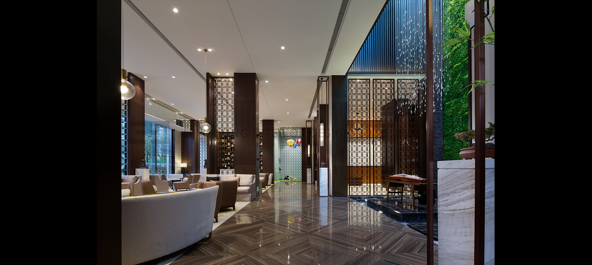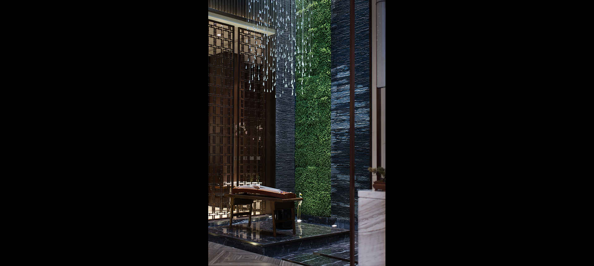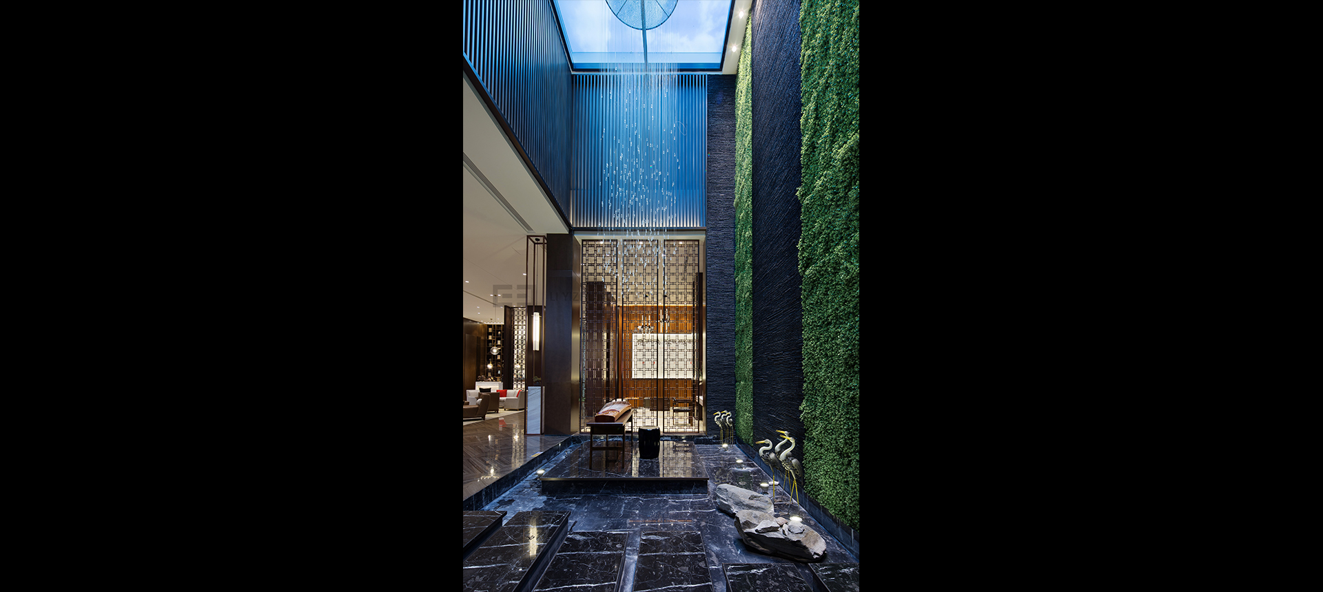 阳光与水晶珠帘透过中庭天窗倾泻而下,宛如细水瀑布,营造静中之动。富有线条感的文化石墙与垂直绿墙的相互映衬带来一股绿意与流线感。