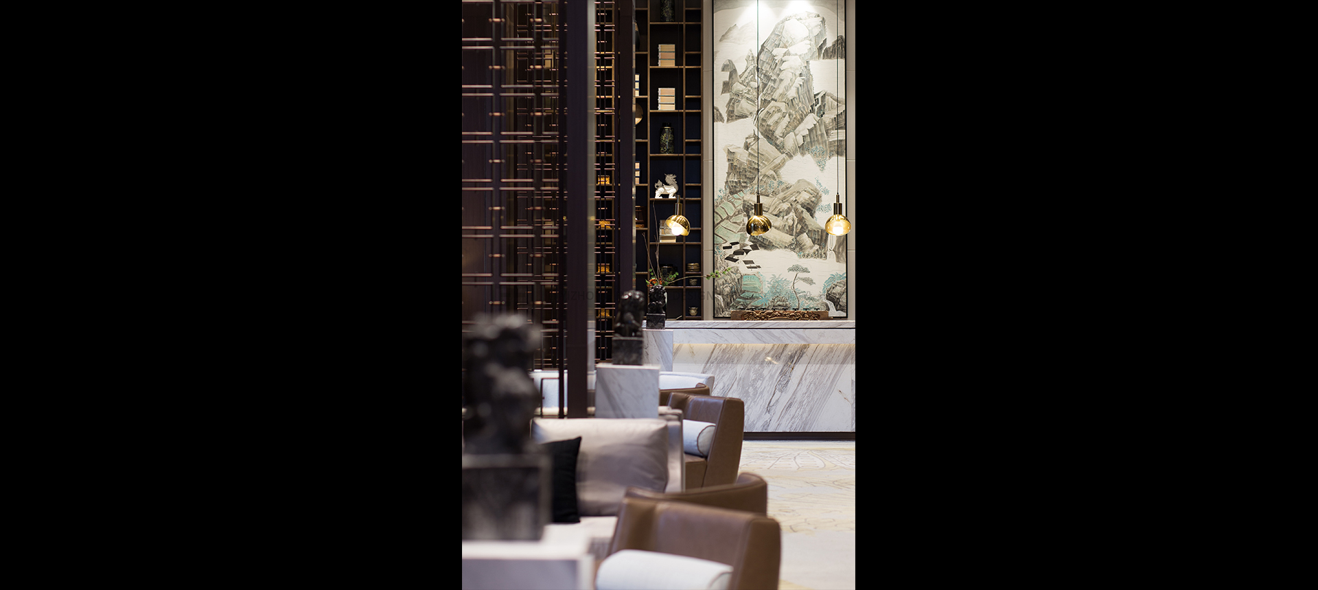 设计师多用深色木饰面及古铜拉丝钢格栅屏风作以点缀,创造虚实写意的框景,营造空间的层次感。