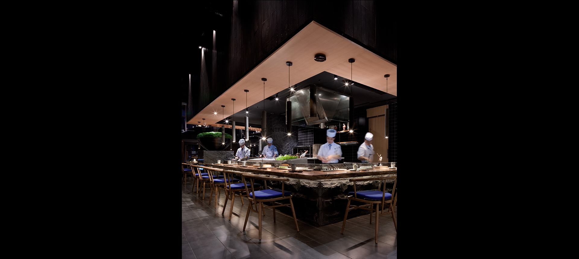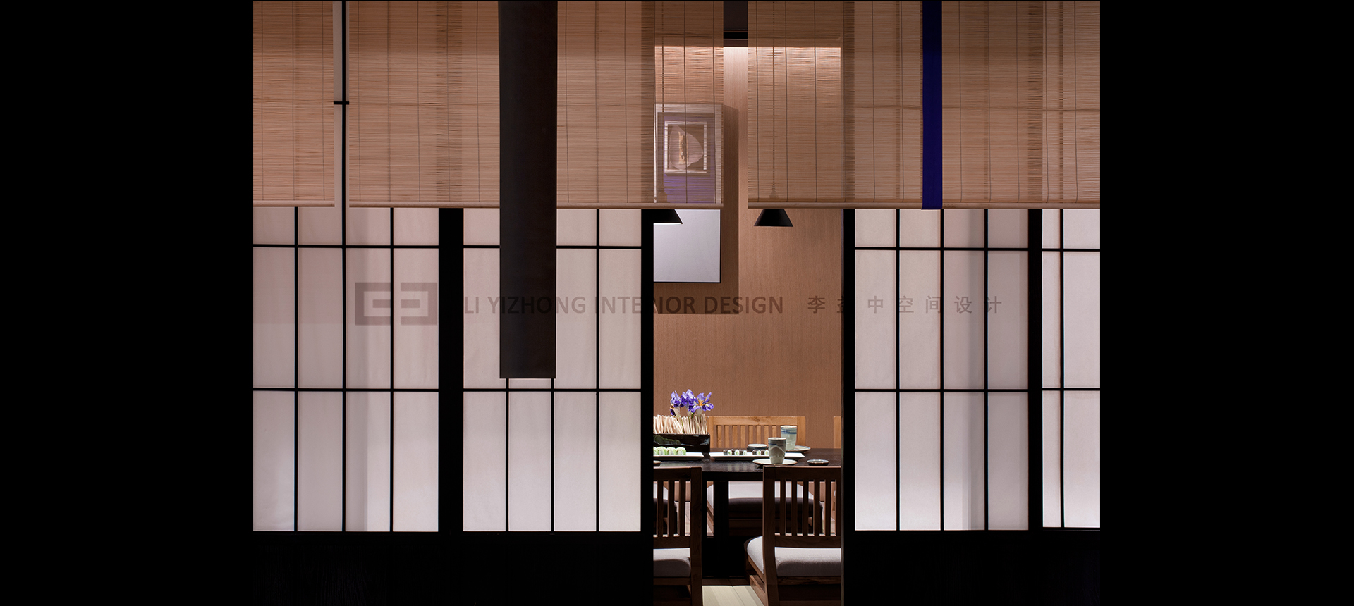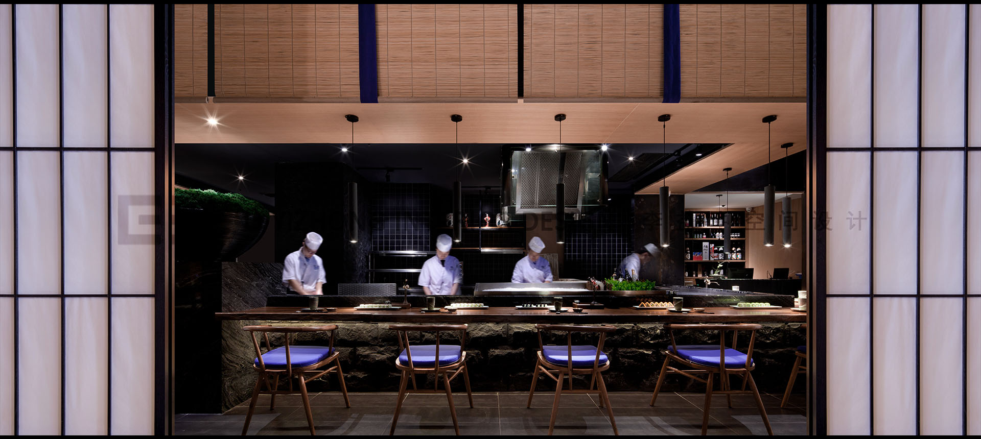 设计主材:灰色大理石,斧凿石,深色石板,钢化玻璃,夹胶玻璃,黑色拉丝不锈钢,木饰面,实木板,老榆木板,障子纸,墙布