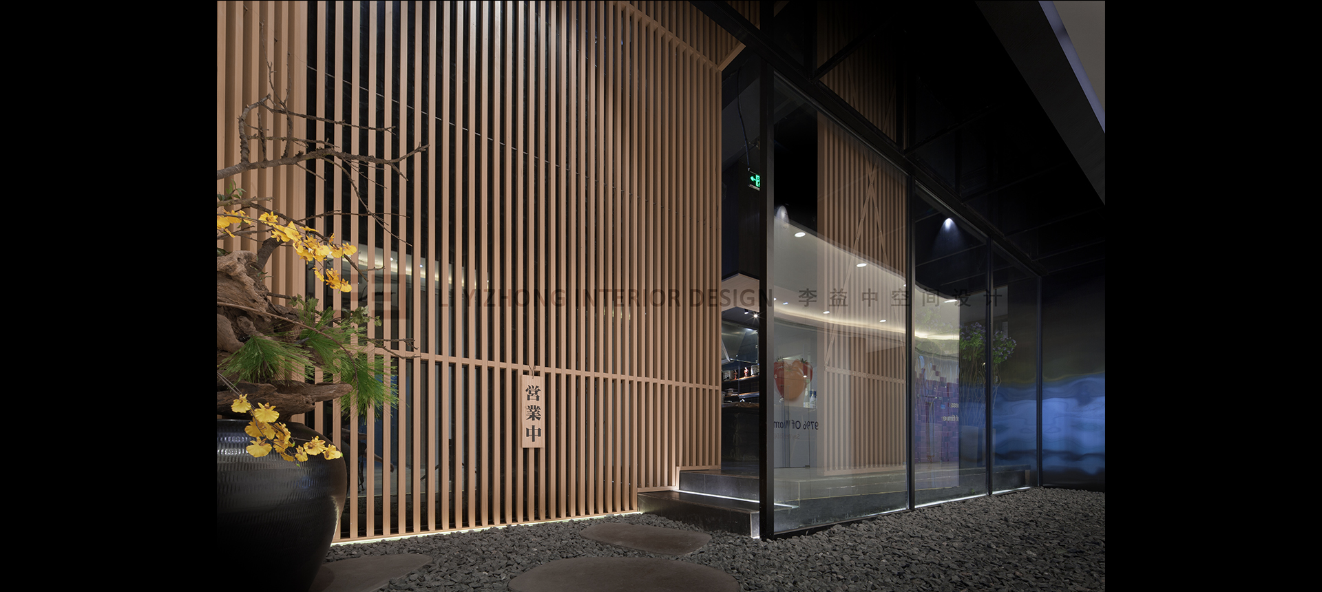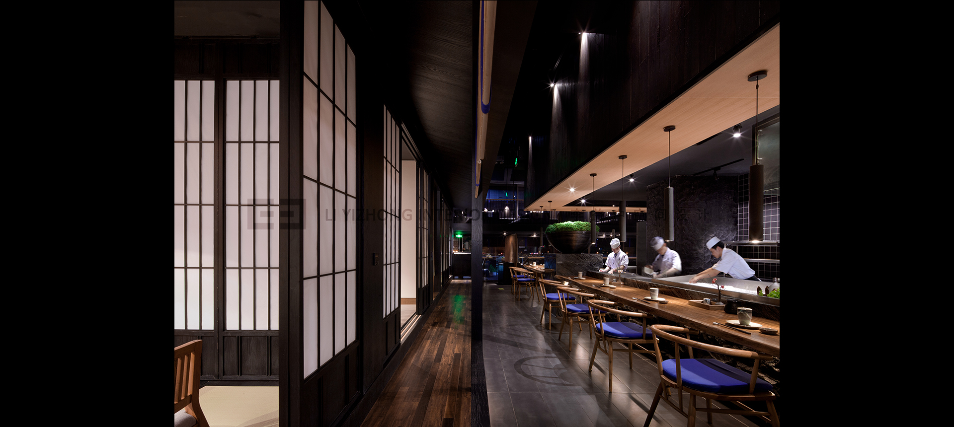 餐厅的门头沿用了日式的禅风意境,当进入餐厅,人们会通过小廊道,营造出曲靖通幽的感觉。