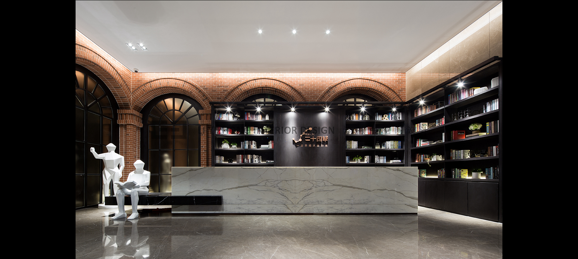 因为工期很紧,意味着又是一次建筑、园林、室内、营销各工种的联合会战。项目所在地与大连工业大学毗邻,社区有两所学校,一所中学和一所小学,因此设计的感觉定位学院风,像美国大学的图书馆。