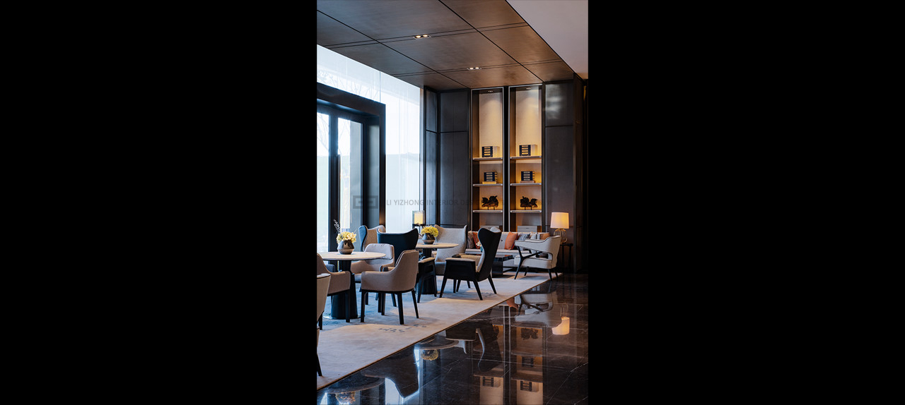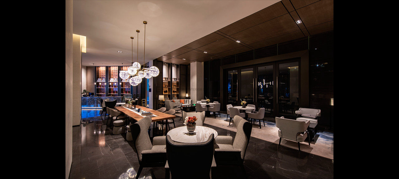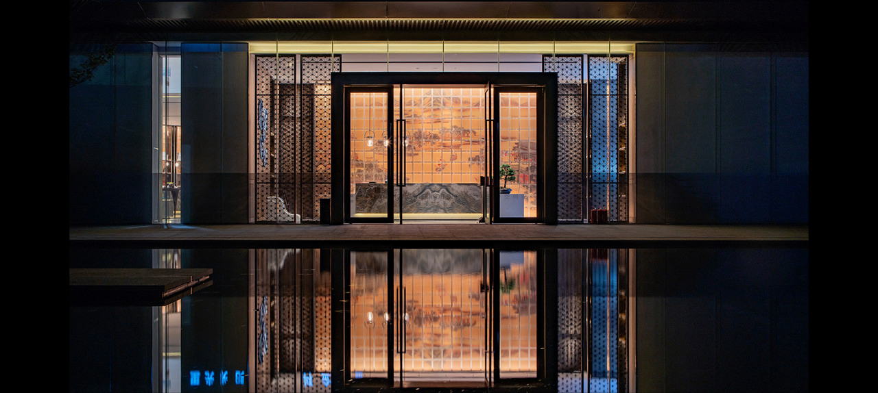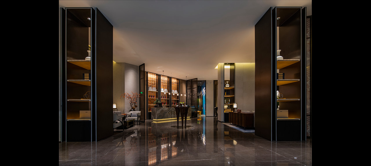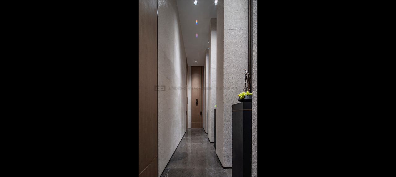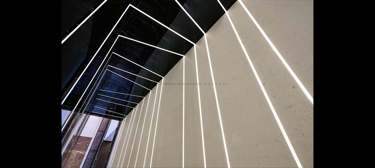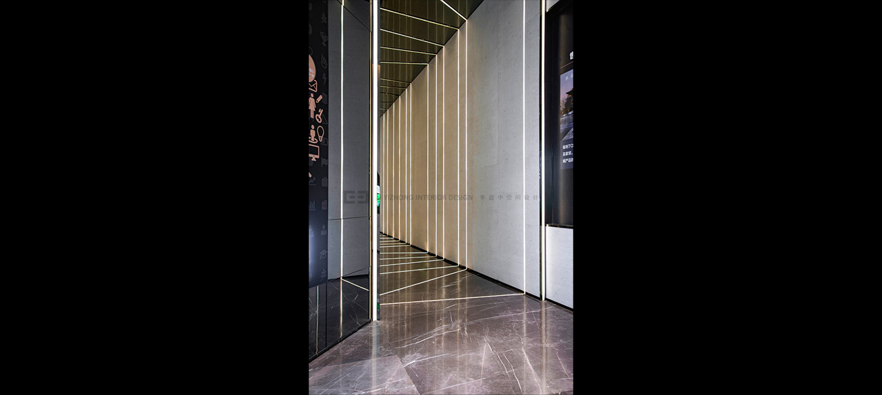 时光隧道,梦幻而神秘。石材上不规则的条形壁灯,照应在大理石上,反射出一条条婀娜多姿的形态,交相辉映,犹如置身在万花筒般的意境里,真真假假、模模糊糊。展现历史性与现代化的共生关系,就如行走在时空任意门的边缘。