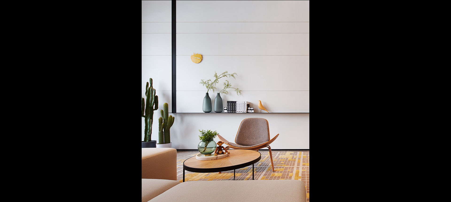 自然石材,绵麻布艺,素雅的木饰面等硬装用材,都选择低饱和度色调,使空间呈现素雅的气质,亲近自然。
