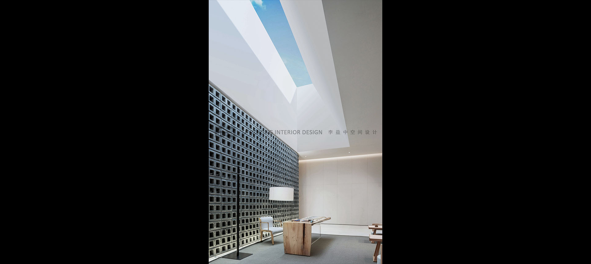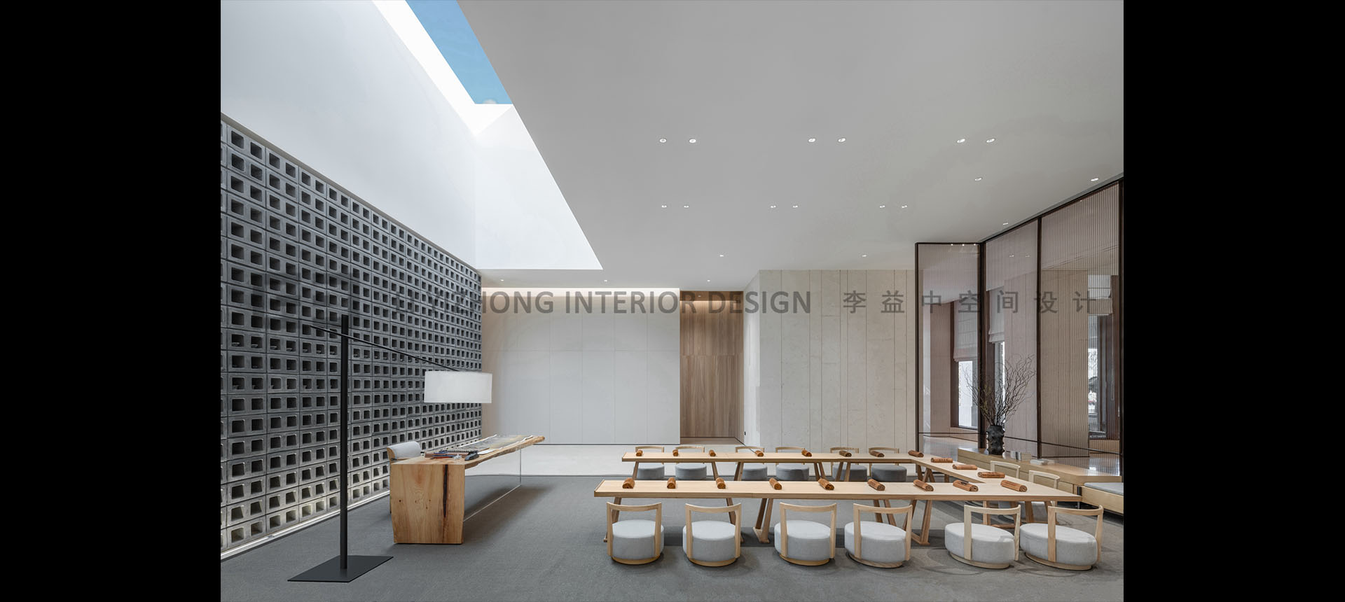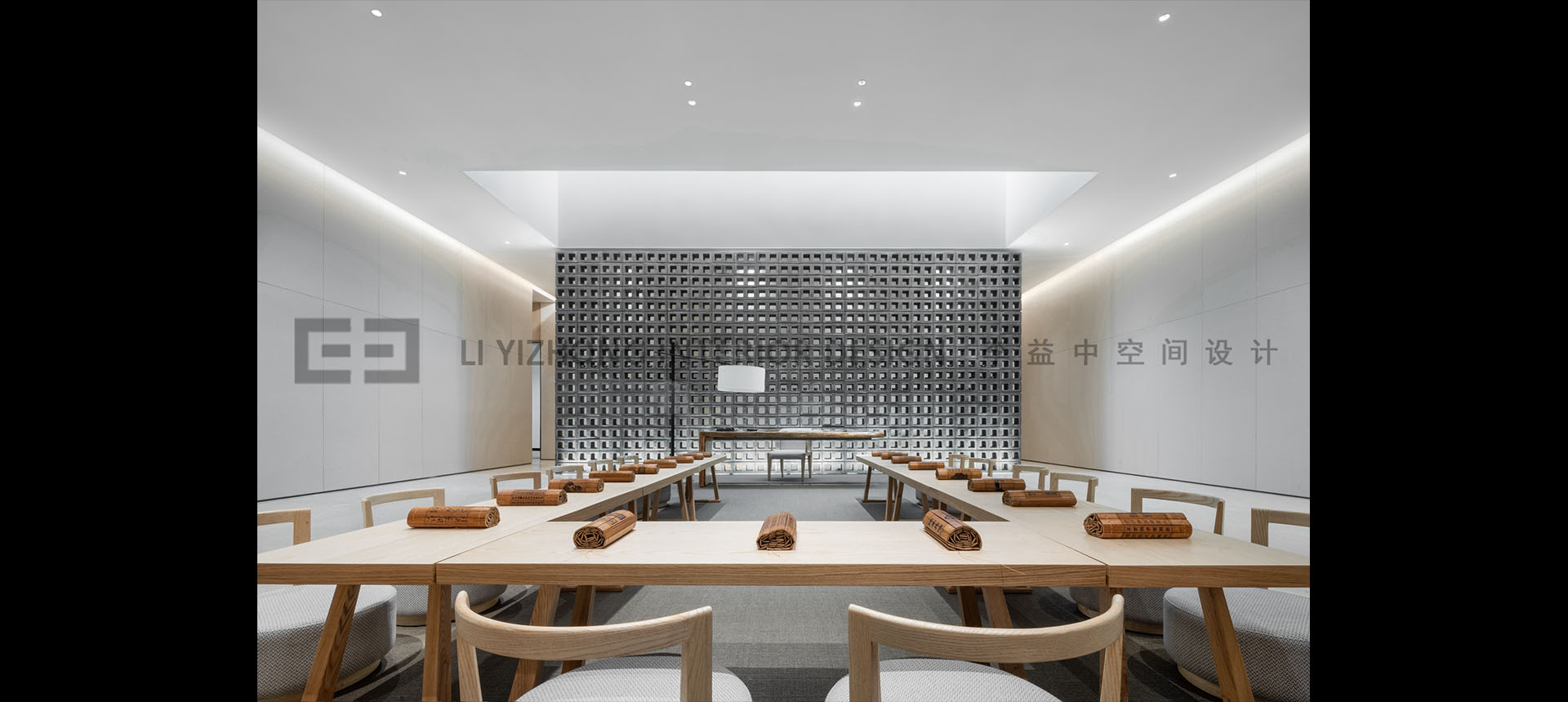 正面背景墙由灰色的水泥镂空砖砌成,水泥的质地与镂空的方洞编织出一幅虚实相生的美丽图案。这个空间设置了一个长条楔形的天窗,光喷涌而入,笼罩着体验区一切,打在书桌、水泥镂空墙上,映照出质感不同的光,反射出一道纤绝的尘陌。光是空间的灵魂,是雕塑空间的巧手,也象征着智慧与精神的引领,光是这个“讲学堂”的“神”,象征着一种对知识的向往,光从硕大的天窗倾泻而下,在空间中反射流转,人们沐浴在柔和充盈的光影之中,感受着空间的虚实缥缈与光明的指引,随之进入高潮。