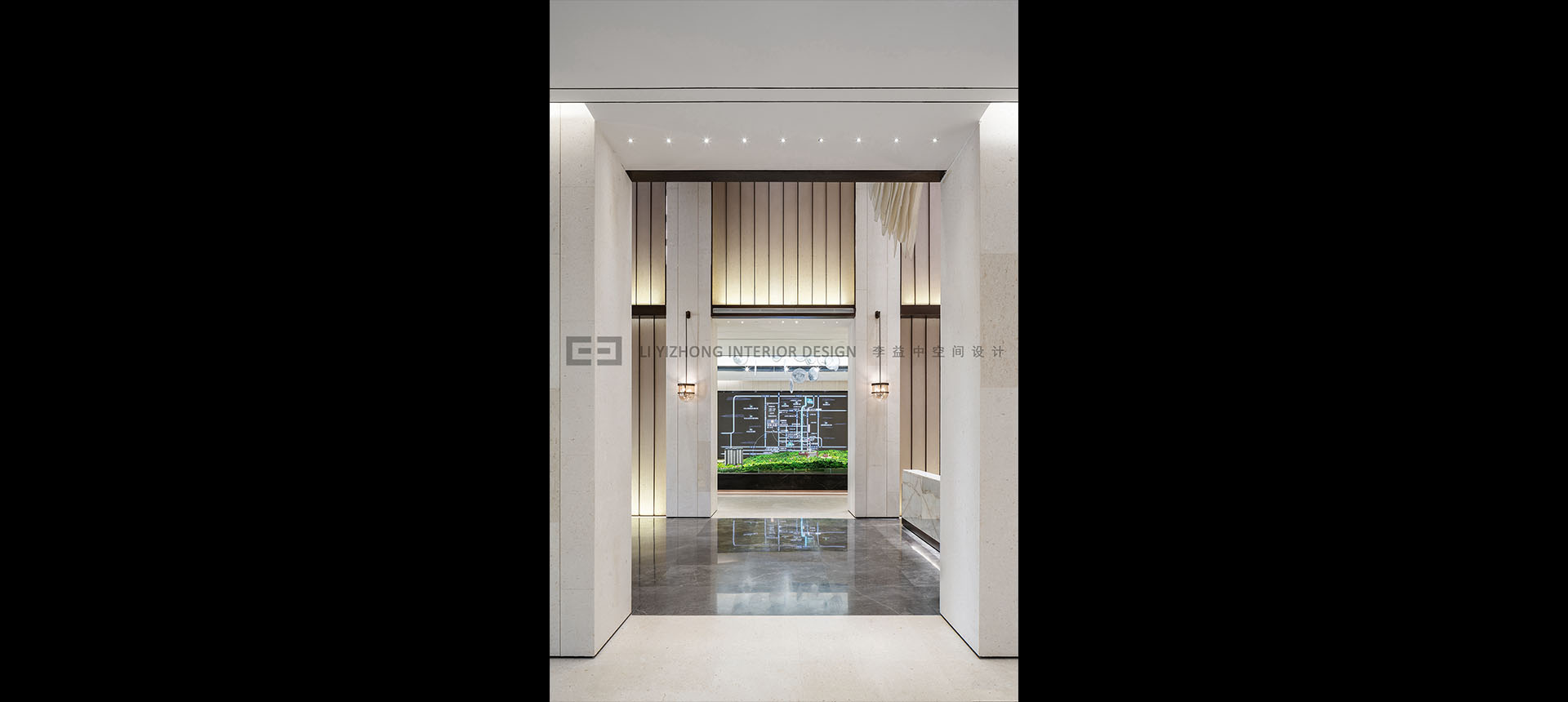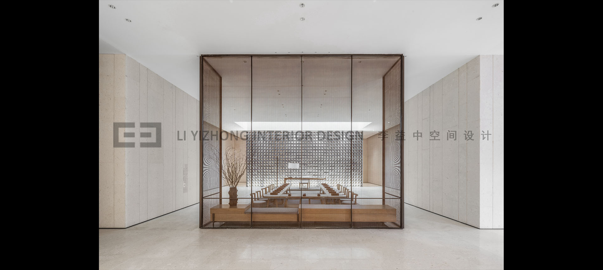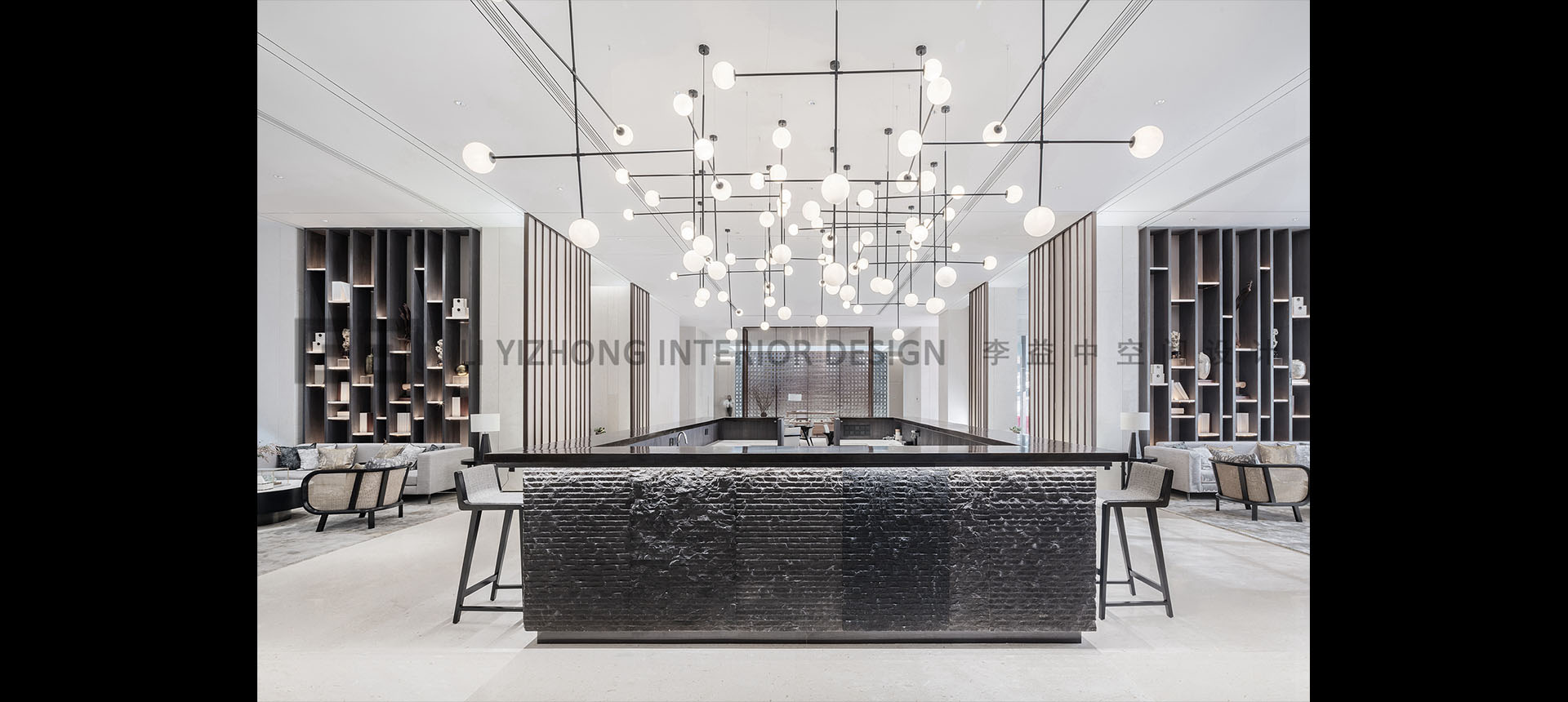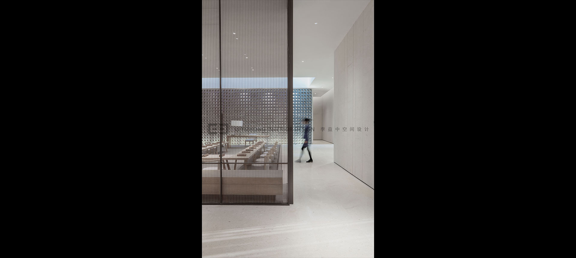 洽谈区的水吧台为中心,洽谈单椅围绕其散落四周。洽谈区的光影柔和,仿若牛乳一般,在竖向排列的线条秩序流向中,水吧台吊灯的纵横交错的构成如大珠小珠落玉盘的搭配,似星空点点繁星统领了空间,成为空间焦点。吧台的剁斧石的粗朴质地和应沙发、座椅及毛毯的柔软,以及空间界面的光洁,唱出材质的交响。
