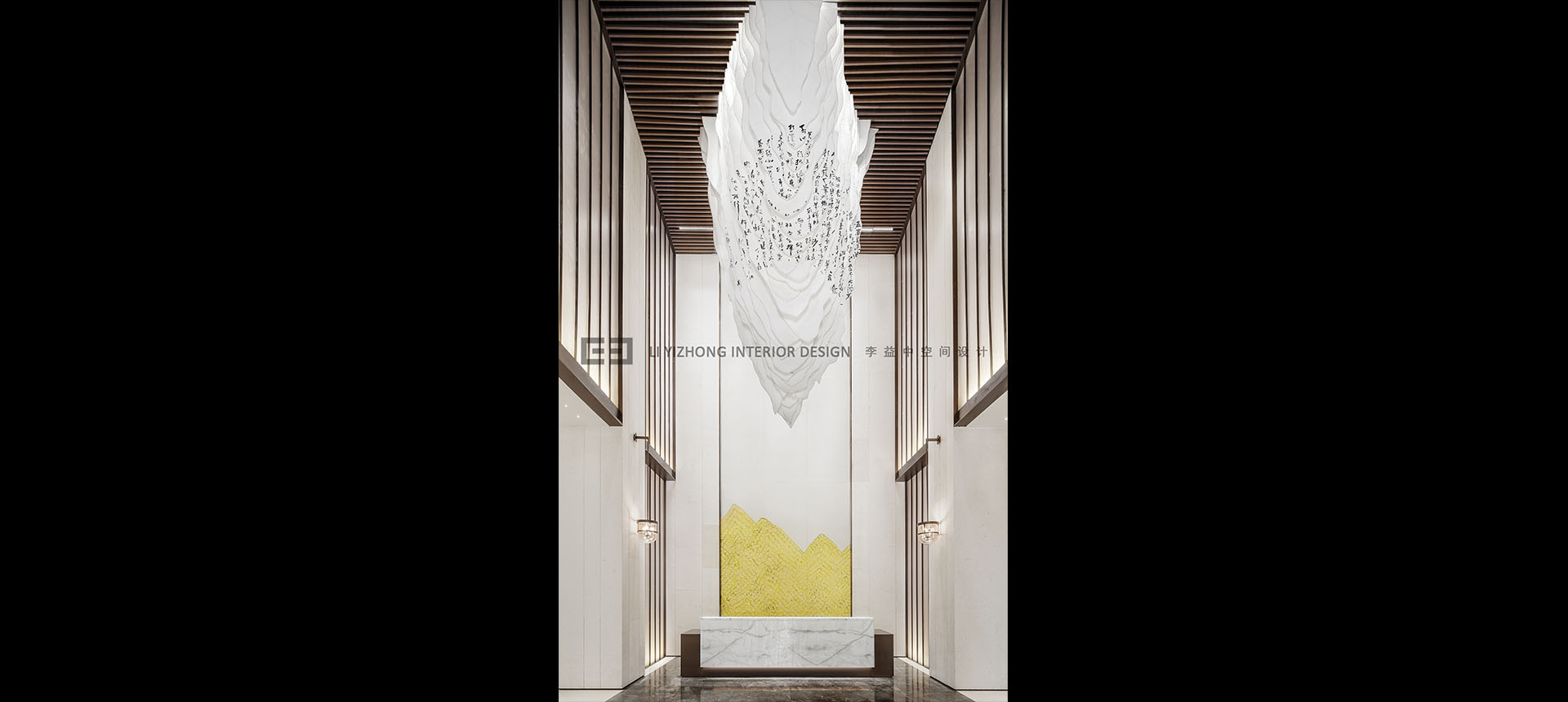 日光朦胧,亚克力吊挂似水墨晕染山水画,与光发生交叠,撒落树影婆娑,运用通透的材质让光在屋内漫游并创造出不同的变化,让光线以丰富的形式在建筑内部留下痕迹,如山涧薄雾暮色正雅般迷人。