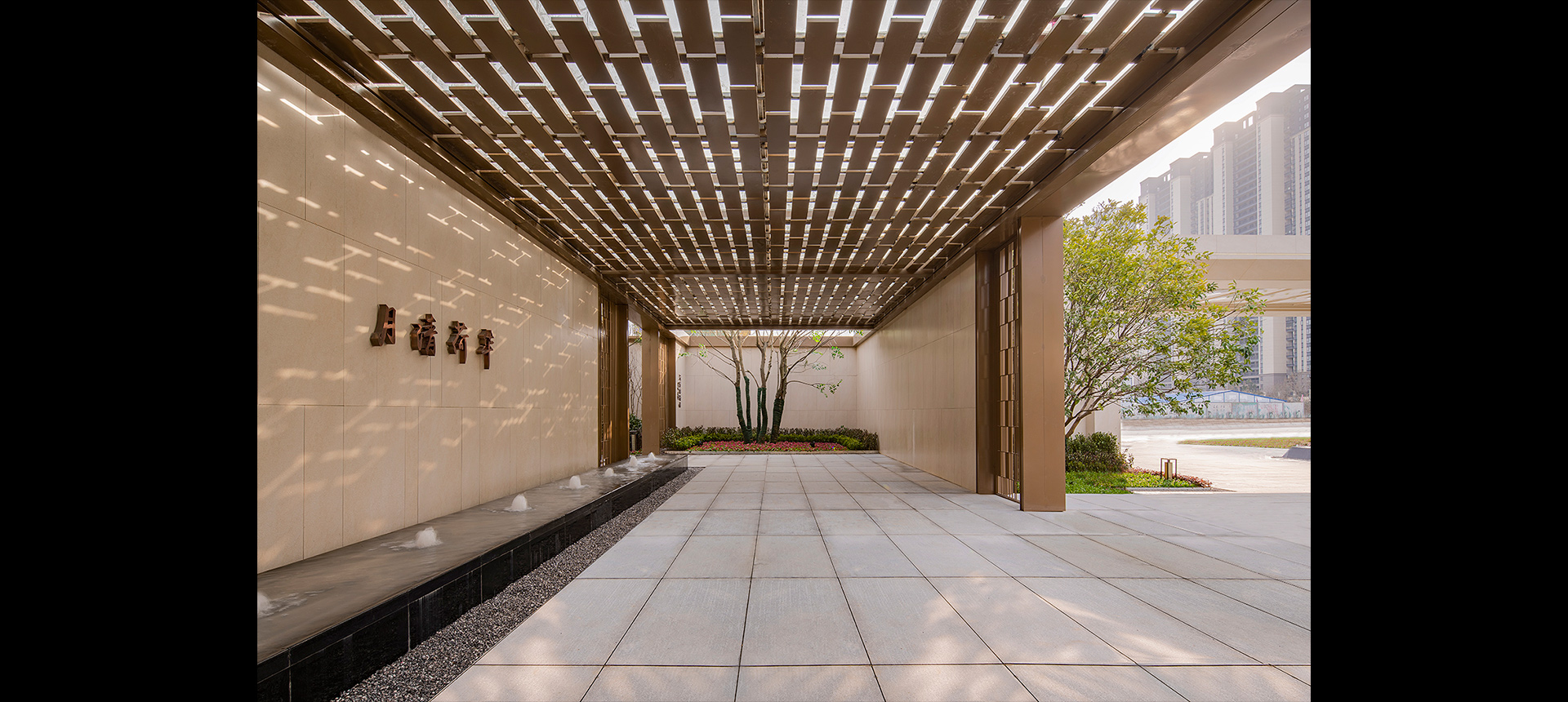 整个售楼处是一个体量庞大的L形建筑,进入室内前,需走过一段被水景左右的“踏月”长廊。步入室内,将山峦起伏隐映于白色背景墙的接待厅带来第一眼的视觉冲击,背景一侧设计师做了通透处理,穿透木格栅户外景观若隐若现。