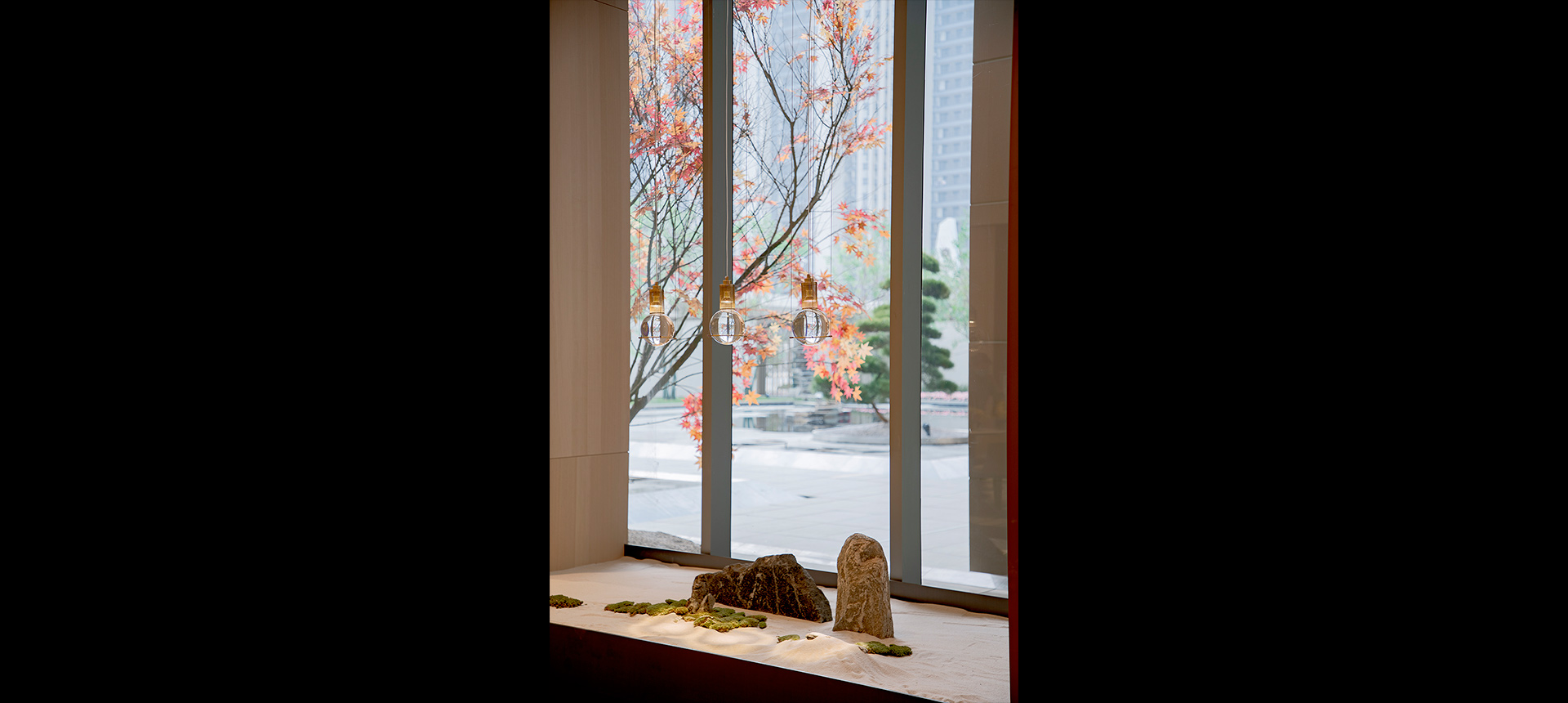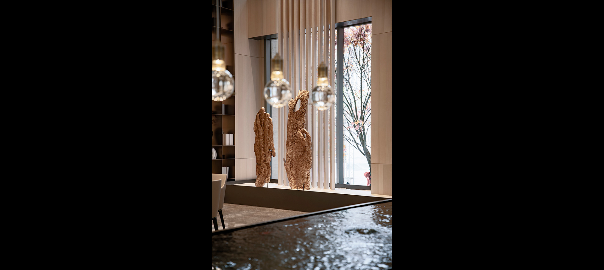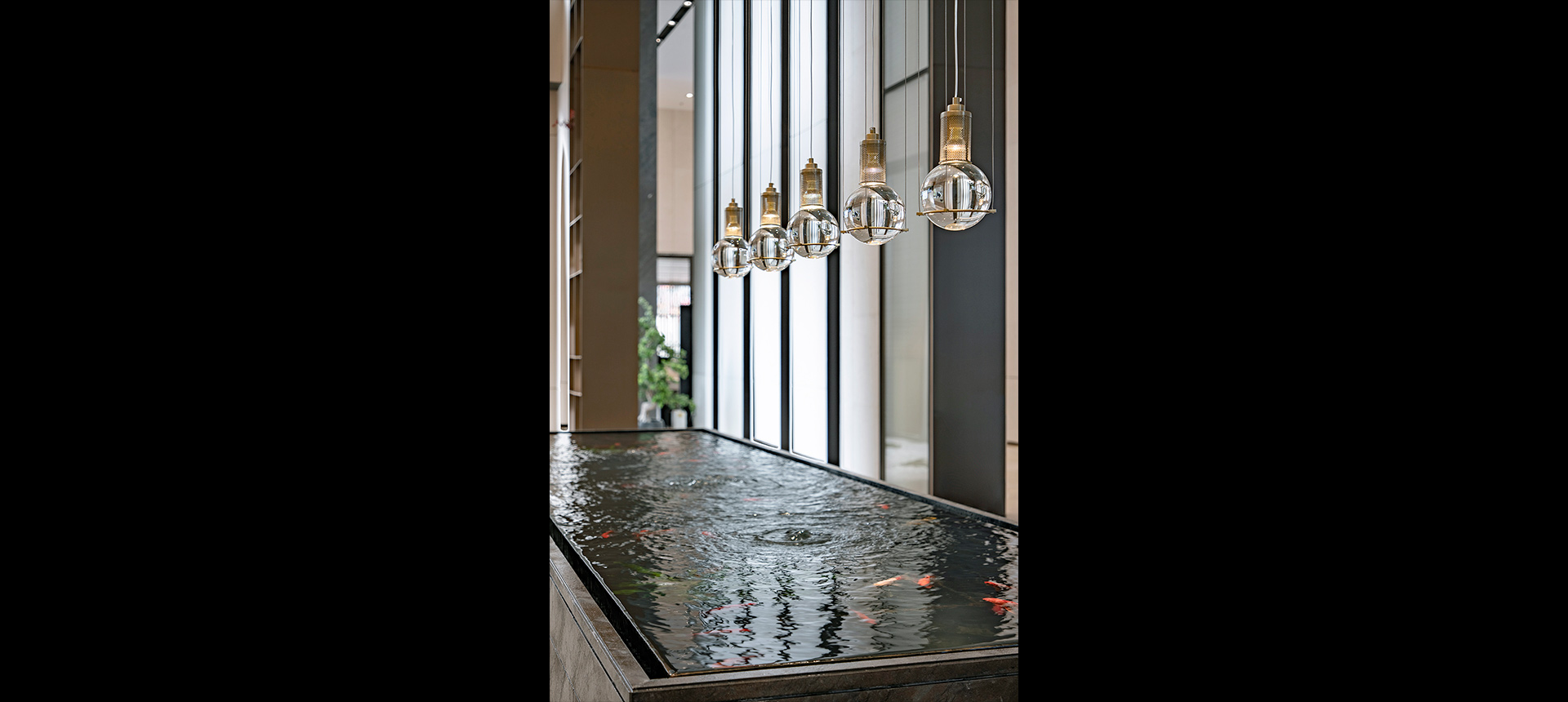 沙盘区与大厅隔而不断,继续往前,便是一方鱼池,欢快的鱼儿在流动的水中嬉戏,活跃了室内气氛,上方水滴造型的吊灯垂坠而下,右侧曲折起伏的山石与其映衬,有着“移步易景,怡景怡情”的意境。
