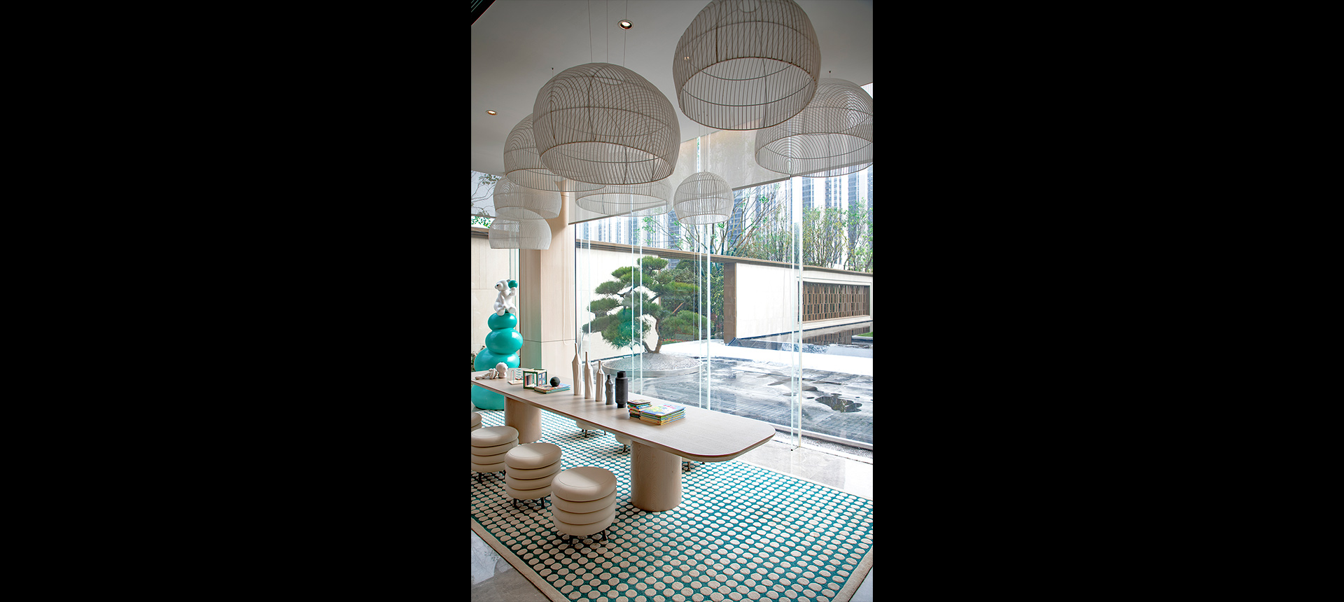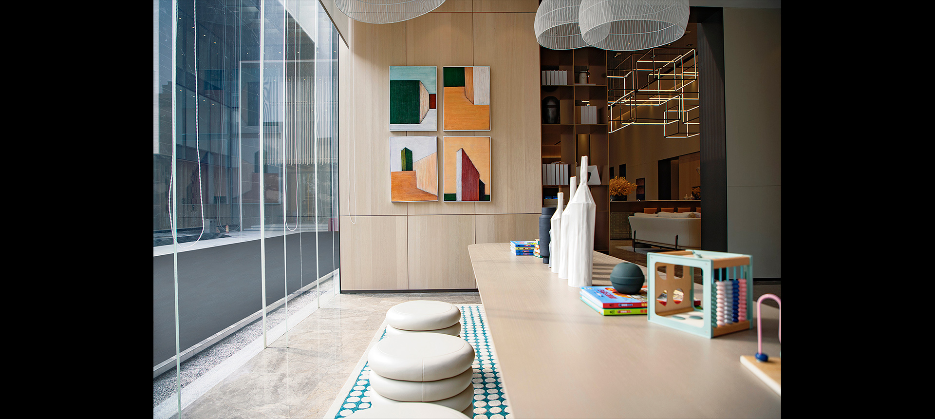 亲子书吧承担了项目展示区入口的第一视觉,所以设计上着重把这里的空间向外打开,整面纯白色书架和书桌,简洁雅致,许多鸟笼造型的灯具错落有致的悬于上方,加上造型好似围棋子的座椅,给室内增添了灵动性和趣味感。