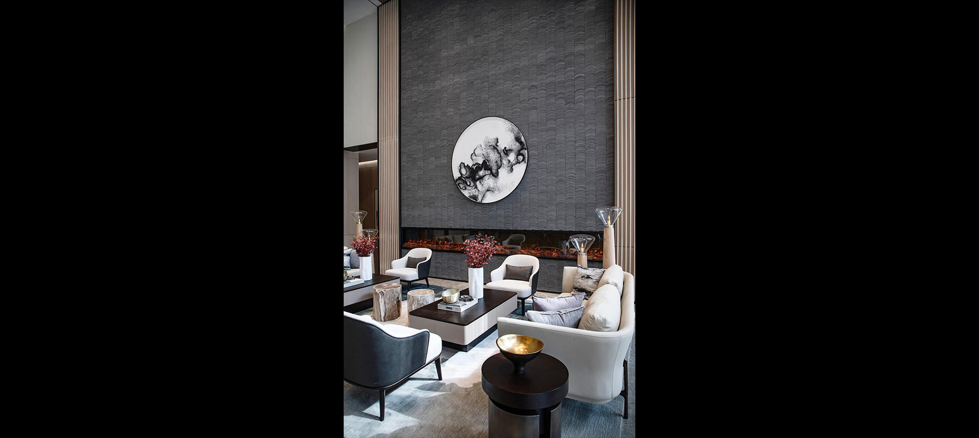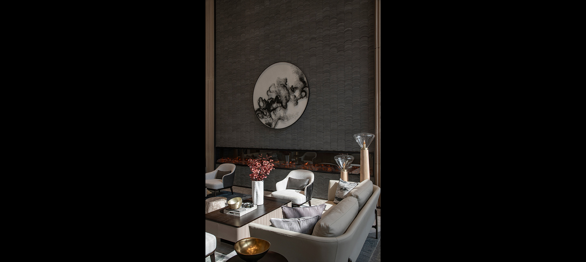 大厅内,洽谈区后的背景墙极具视觉冲击,层层叠叠的灰瓦,是对自然材质的合理编排,附上一幅淡水墨晕染的画, 有着古朴淡雅的东方气派。