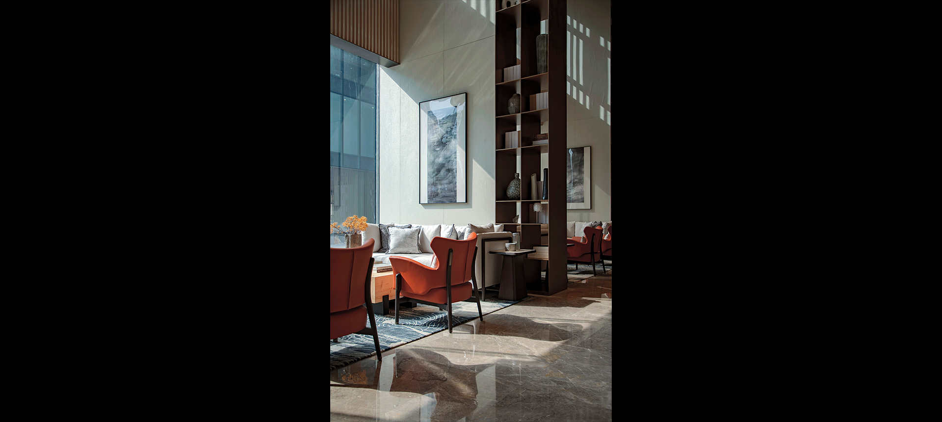 接待厅到沙盘区之间有一过厅,过厅立面结合原建筑的柱体做了虚实的分割,使室外光线与景观映入室内,柱体相对而立,底部嵌入墙体灯带,倒影于大理石地面,形成轻盈的序列感。亦如暗示访客,这场“停留”之境的序幕已渐渐拉开。先抑后扬的空间节奏感悄然无息。